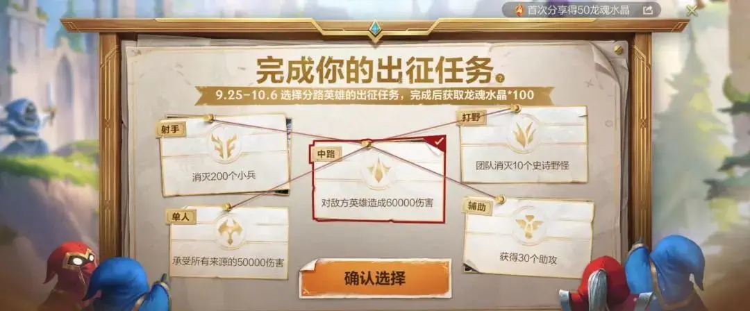 除了绑定好友外,召唤师还可以选择擅长的分路任务,完成专属于自己的“出征仪式”~选择了对应的出征任务后将不可更改,完成任意一个出征任务都可获得龙魂水晶的奖励。