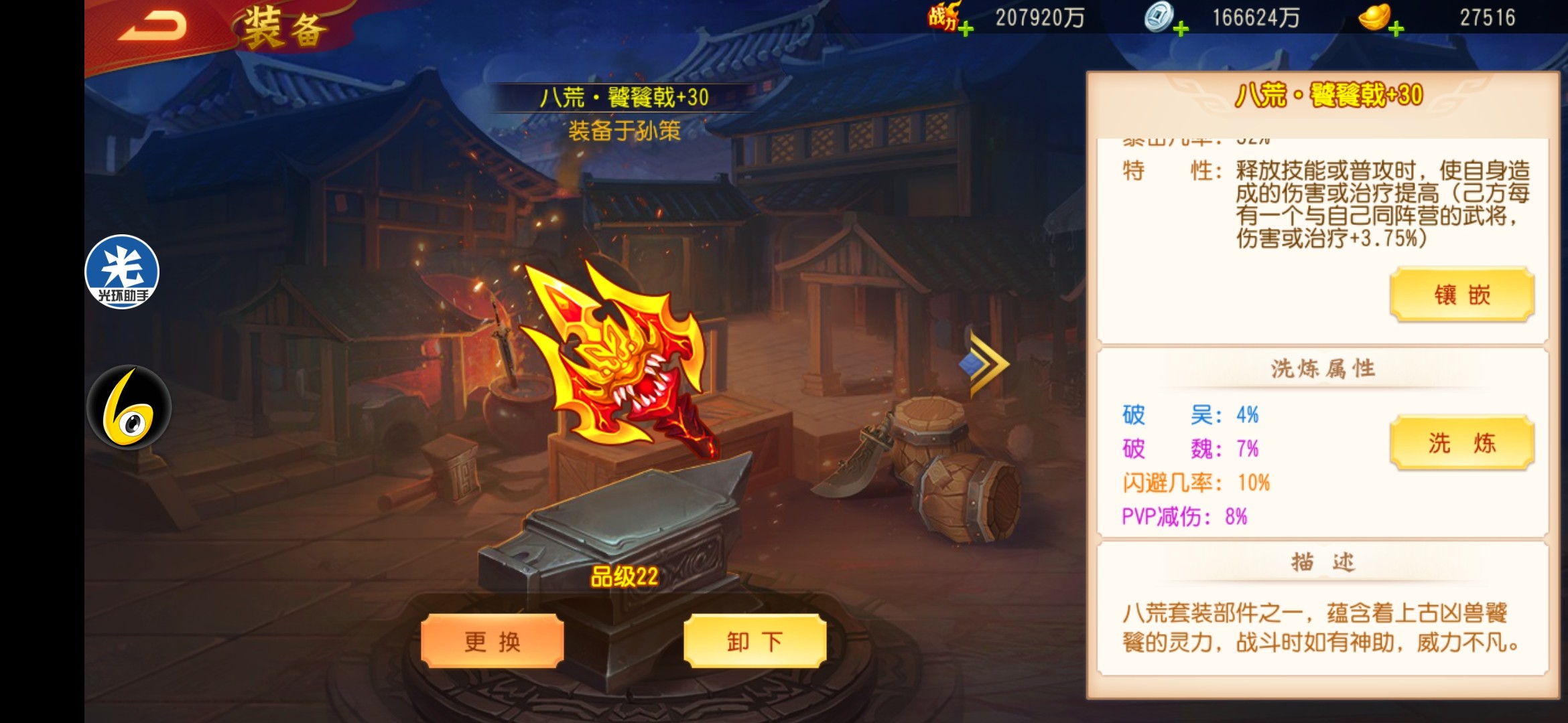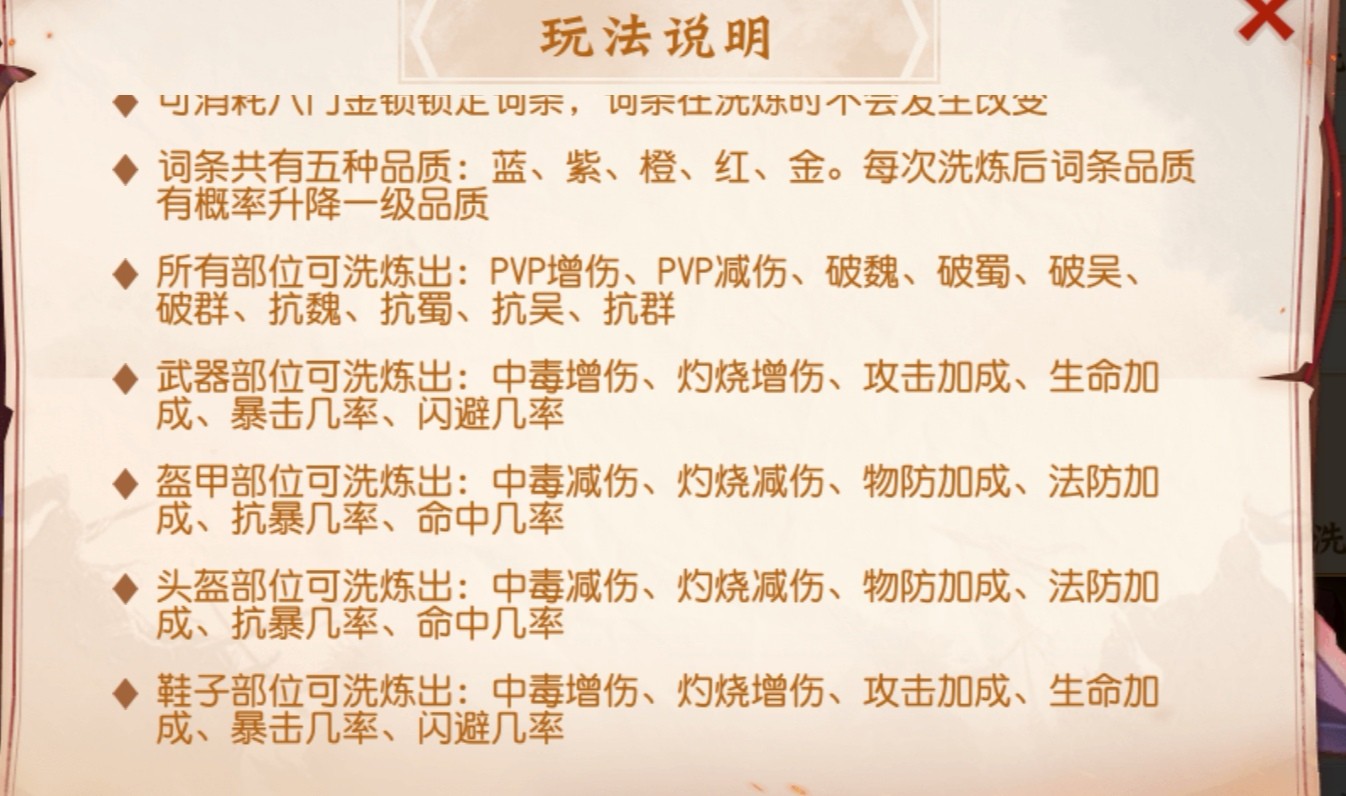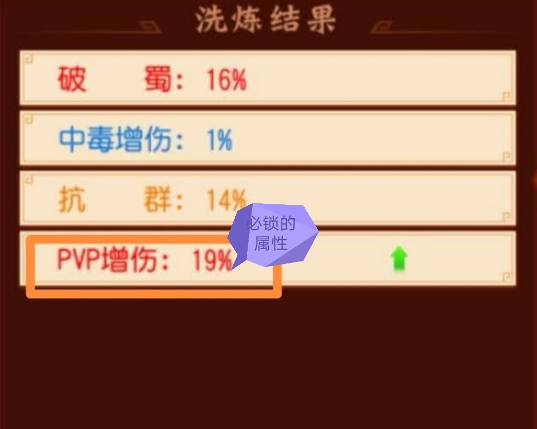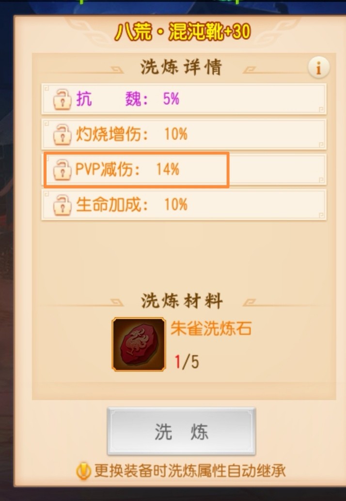 先次~把次要的武将装备先洗出橙属性。最好有PVP减伤的或者是生命加成或者是防御加成的。然后就停下来。一般2到3次就可以洗到。这个时候阵容武将已经确定。让次要的武将多少加一点属性。增加一点生存力。续航能力也会高一点。整个阵容的容错率就会高一点。