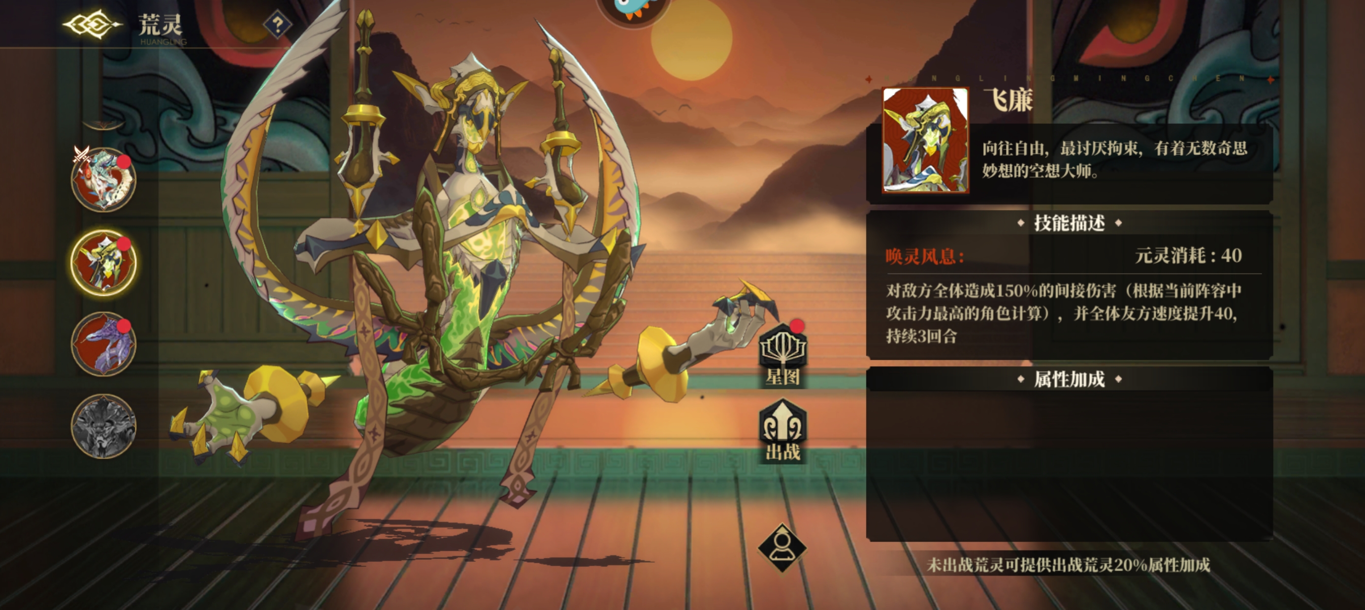 ⑤【飞廉】pvp的神宠,全体加速度,可惜目前pvp并不能上阵荒灵,如果能够使用荒灵。飞廉是最热门的荒灵,配合青鸟,速度拉满。但是目前pve并不太需要飞廉的速度加成。