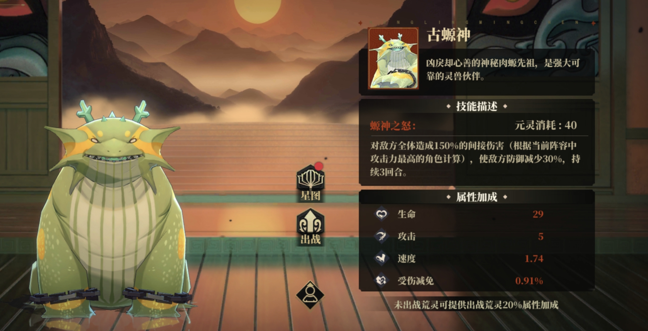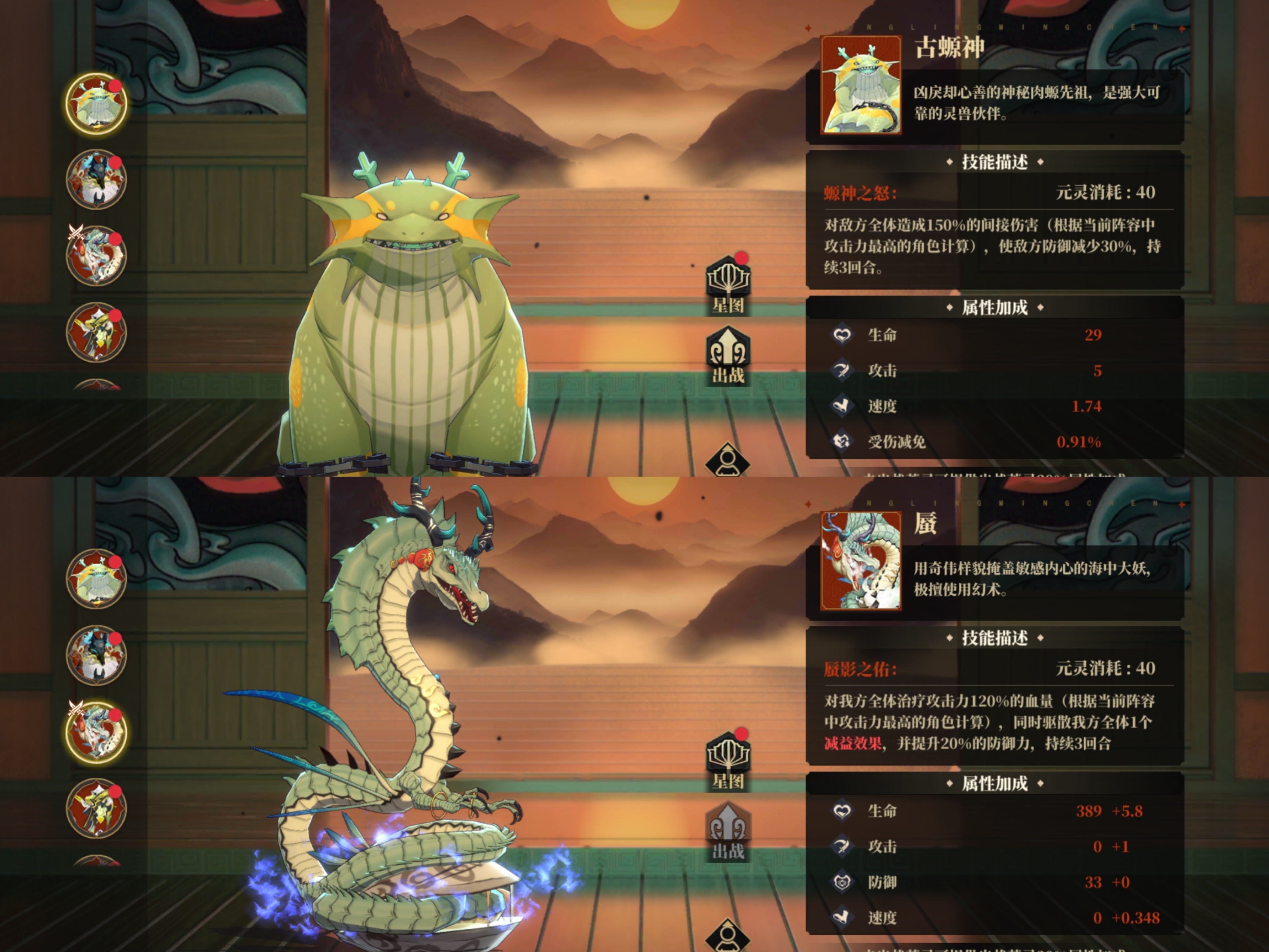比较推荐大家推主线进度的时候用【古螈神】全体伤害+减防御,可以提高队伍输出,加快通关节奏效率。