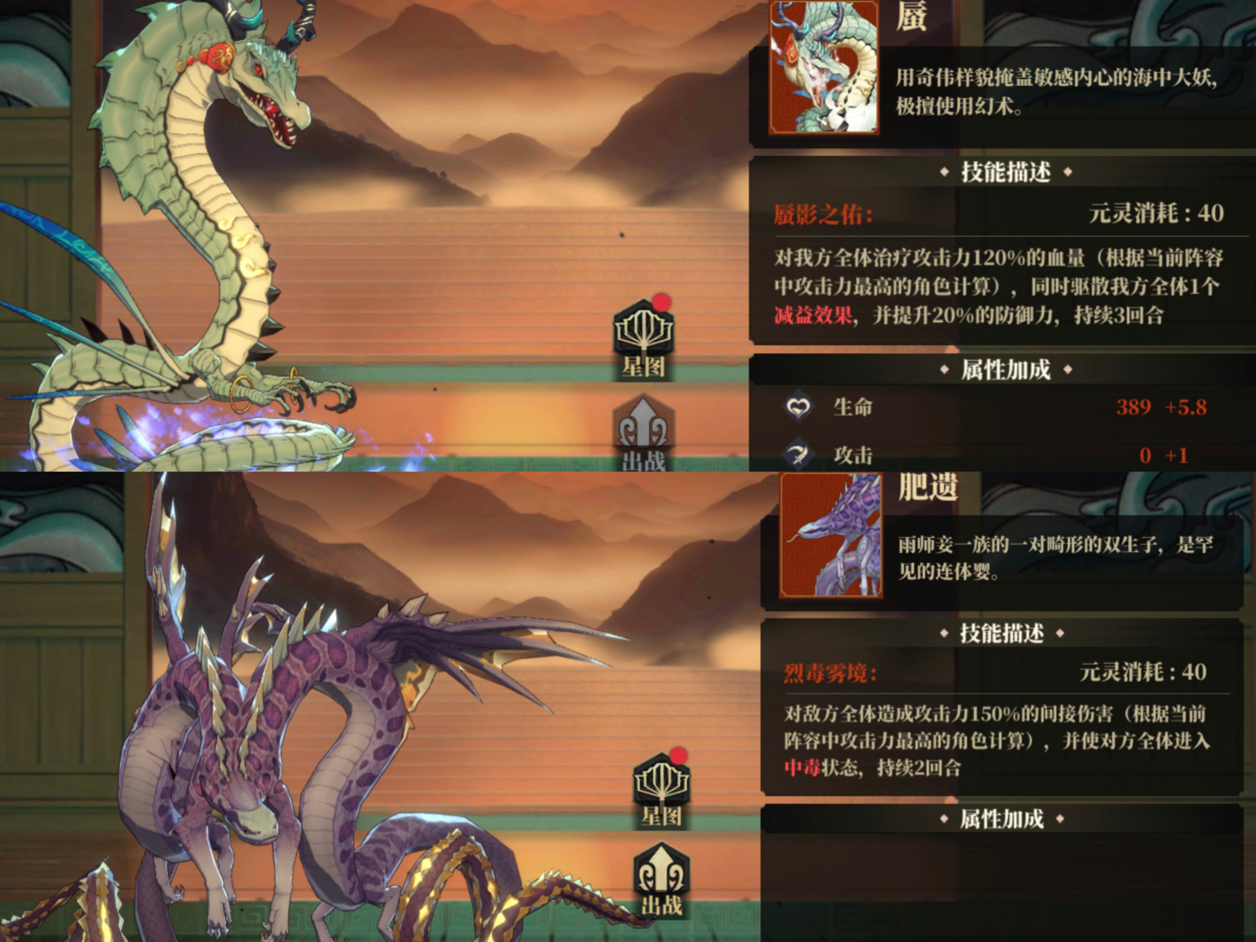 ④【螚侄】全体伤害+大幅度的减疗,目前来说个人觉得现阶段不是很需要,征战副本boss没有治疗能力,历练除了梦魇也都比较简单,比较适合爬塔,但是爬塔可以带肥遗。肥遗有中毒也有小额的减疗也够用了。