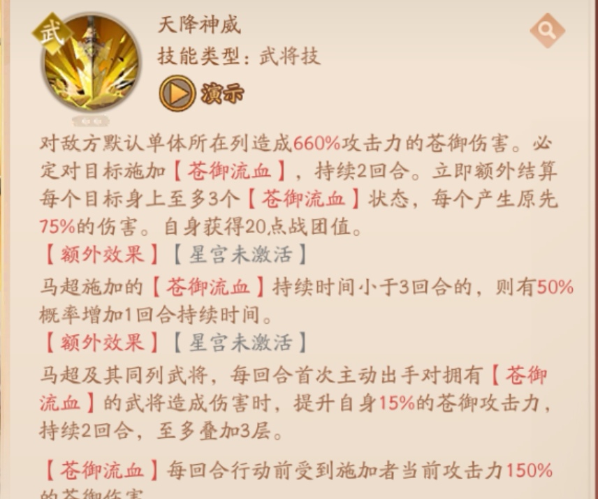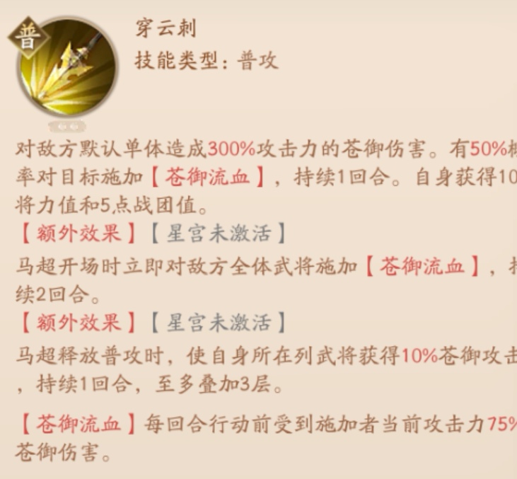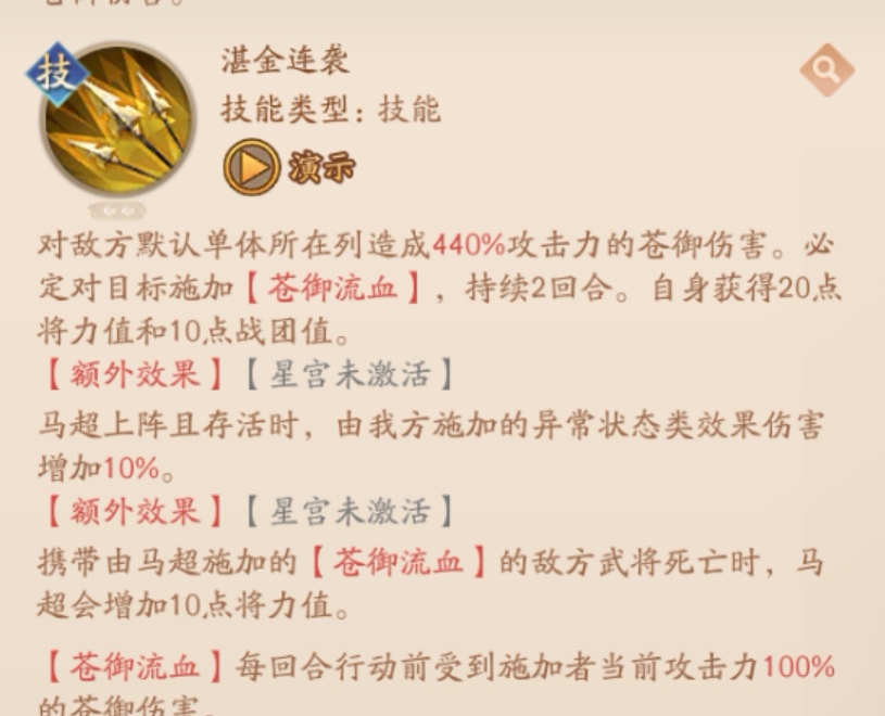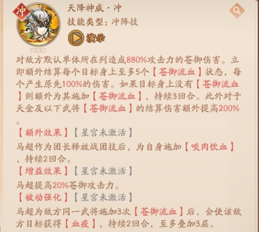 战团/冲掠技:单体所在列,额外结算流血伤害,对天金以下品质武将流血伤害额外增加。星宫1马超要作为冲阵位触发,对有流血单位武将的伤害可以回复造成伤害的百分比血量。星宫2增加马超攻击,也就是增加以攻击基准的流血的伤害。星宫3对施加三次流血单位的武将,立即扣除其生命值百分比血量并且受到的异常状态类伤害增加