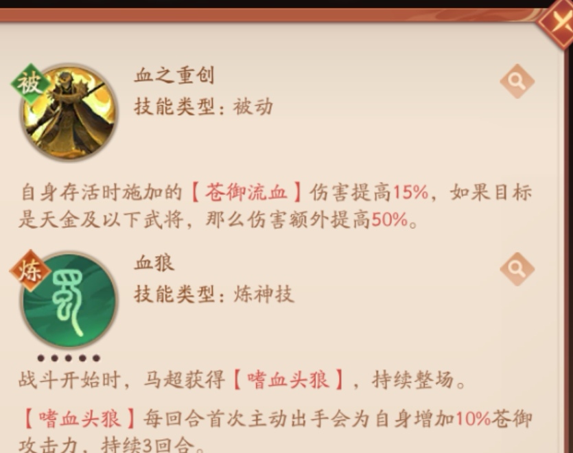 被动增加流血伤害,对天金以下品质武将伤害额外提高。炼神可以增加马超的攻击力,也与流血伤害挂钩。