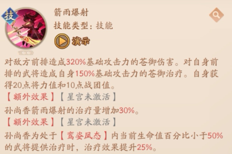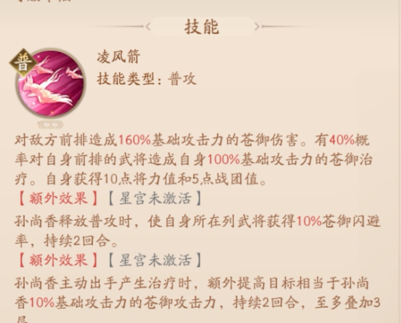 普攻前排一列,概率给我方前排施加治疗。星宫1让孙尚香同列获得百分比属性的闪避,星宫2治疗效果会提高攻击力,最多三层