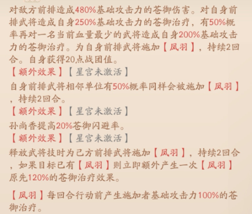 武将技前排一列,治疗我方前排,概率再次施加,并且每回合行动前为我方前排武将施加治疗。星宫1概率施加给前排相邻武将,星宫2增加孙尚香闪避,星宫3对有“风羽”单位立即治疗