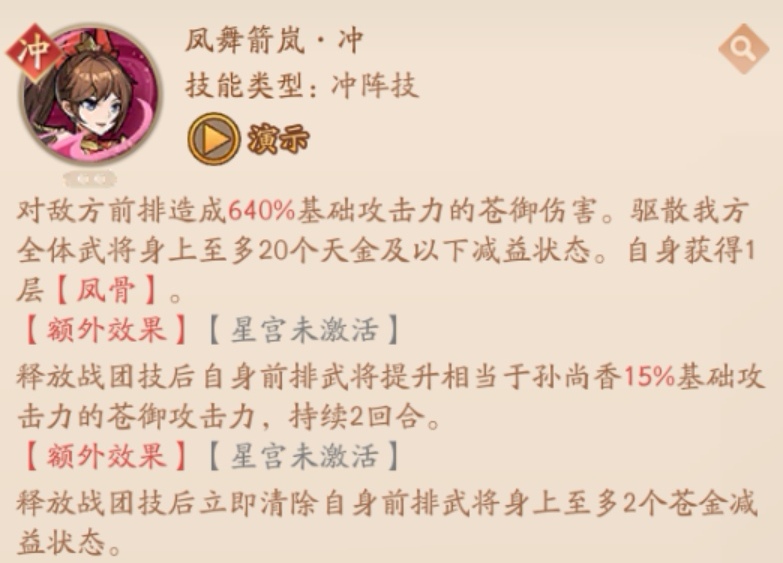 释放战团技后自身前排武将提升相当于孙尚香15%基础攻击力的苍御攻击力,持续2回合。