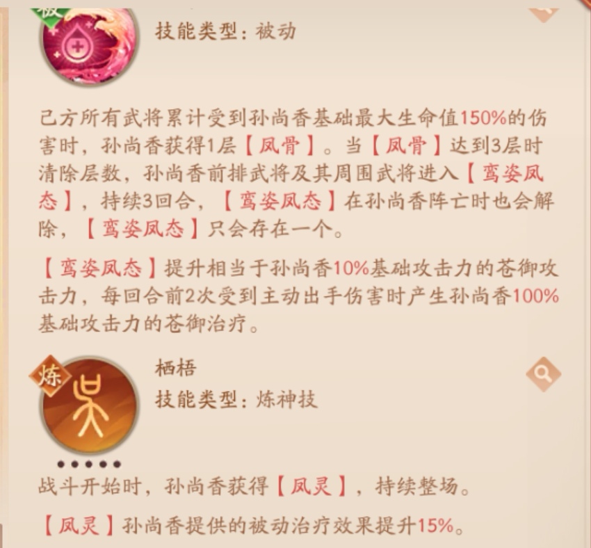 被动治疗获得“风骨”,三层让前排武将和周围武将提升攻击力并且受到伤害会获得治疗。炼神是提高孙尚香的治疗量。
