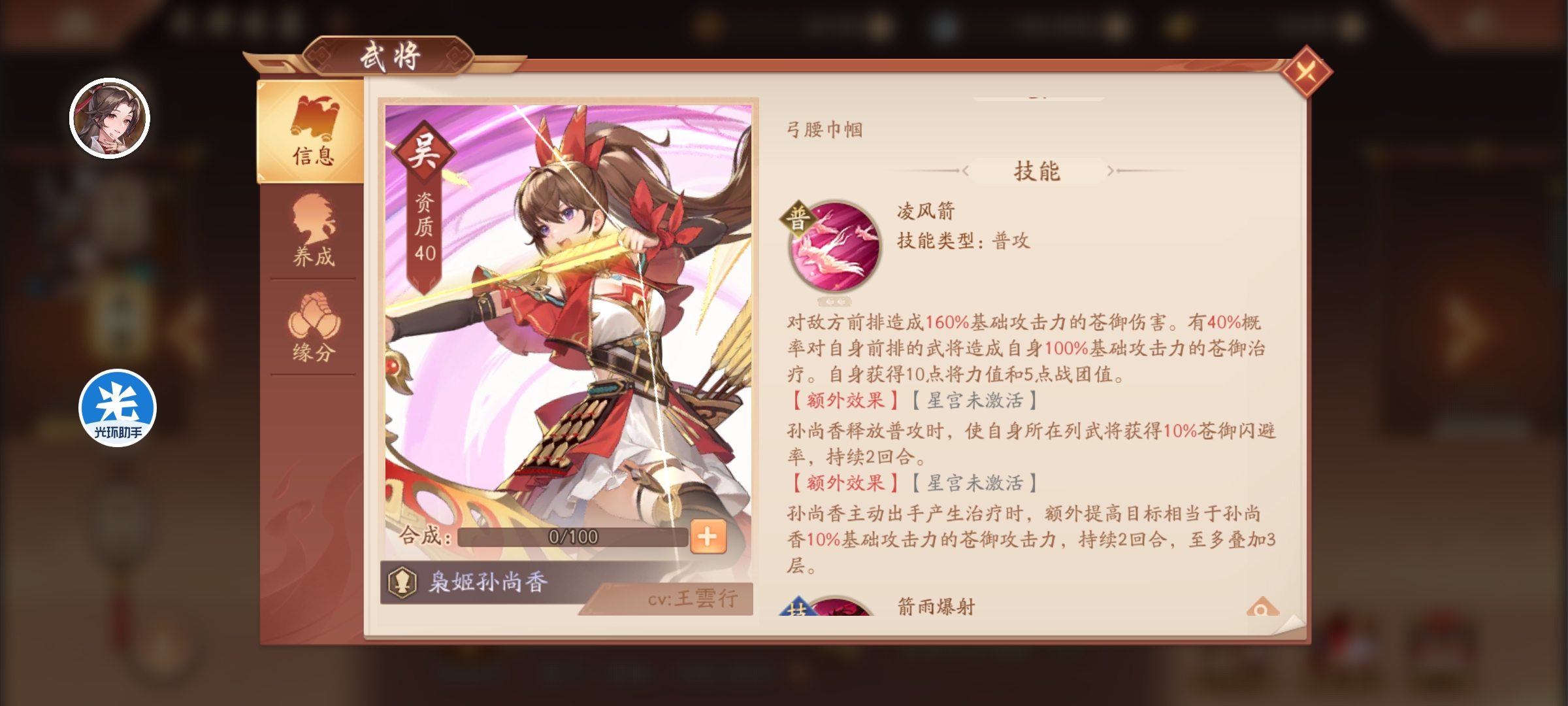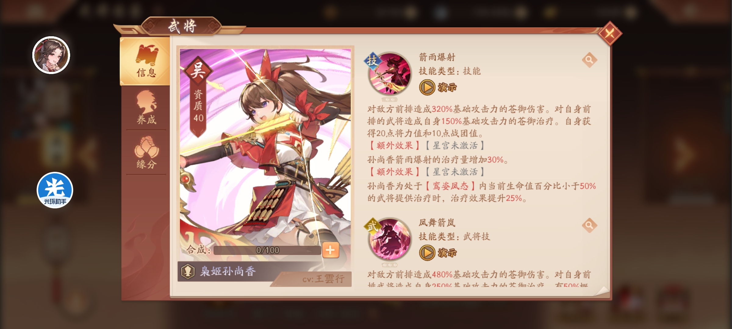 总结孙尚香的技能一看就是团队型辅助,输出的同时还有治疗,像天金四孙坚。缺点是技能系数是按基础攻击力,四个苍金将里面唯一按基础攻击算的,那就不吃加成。