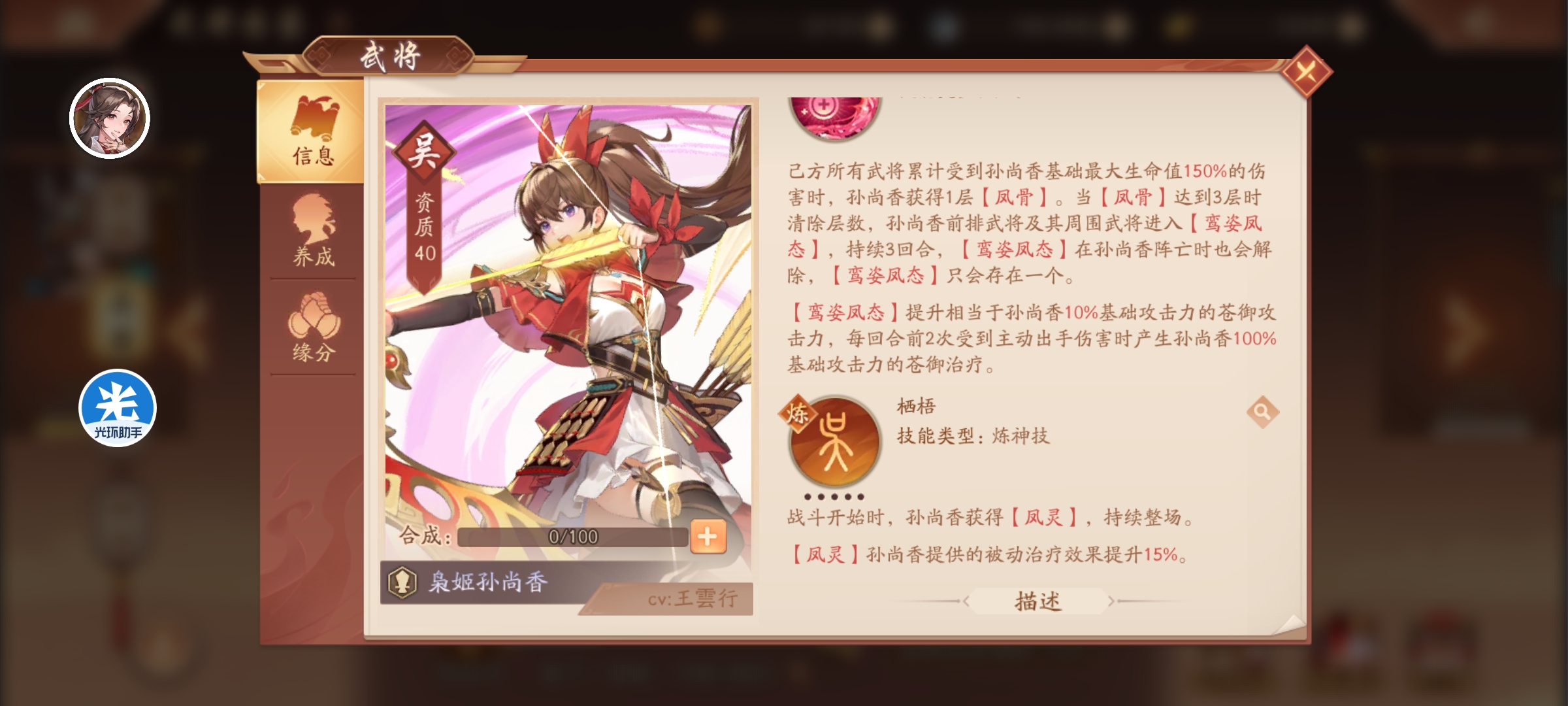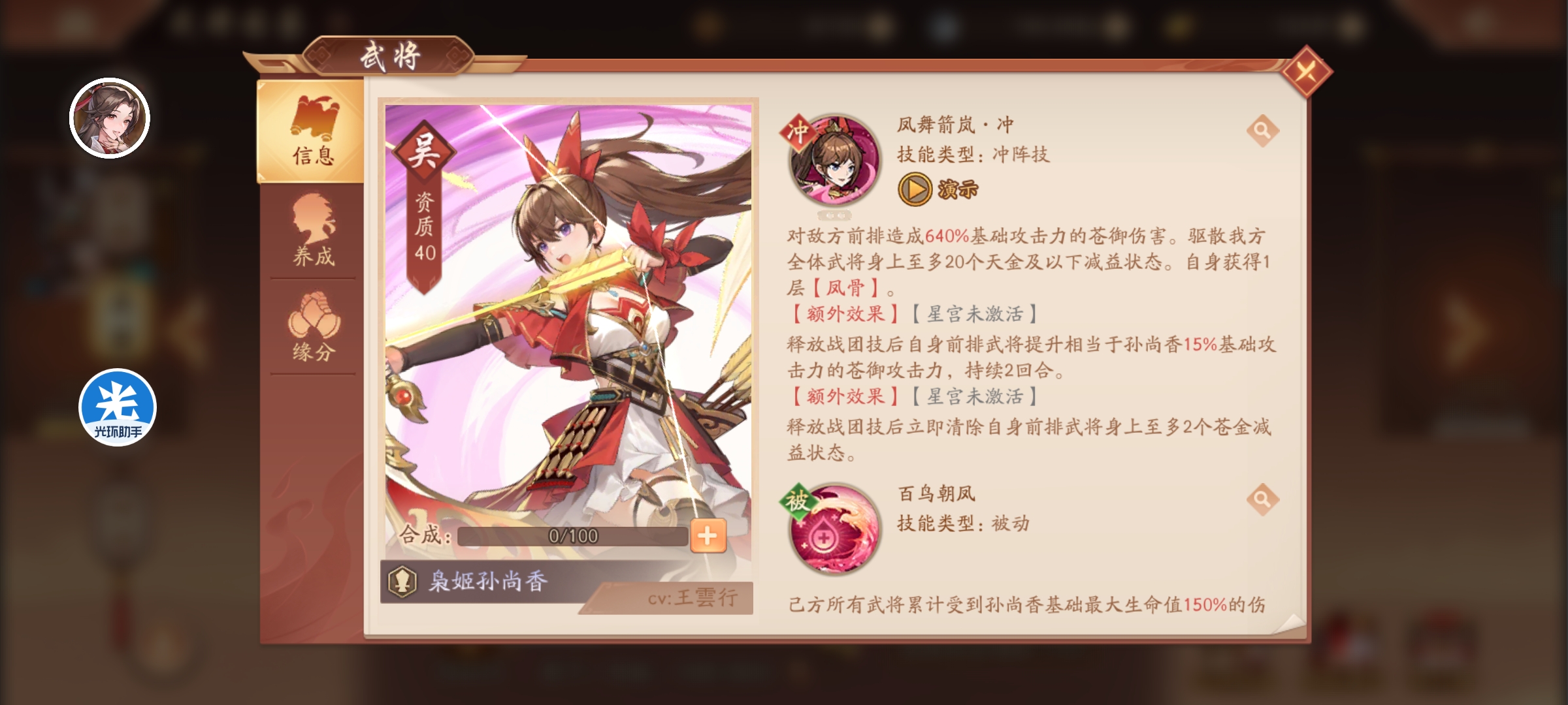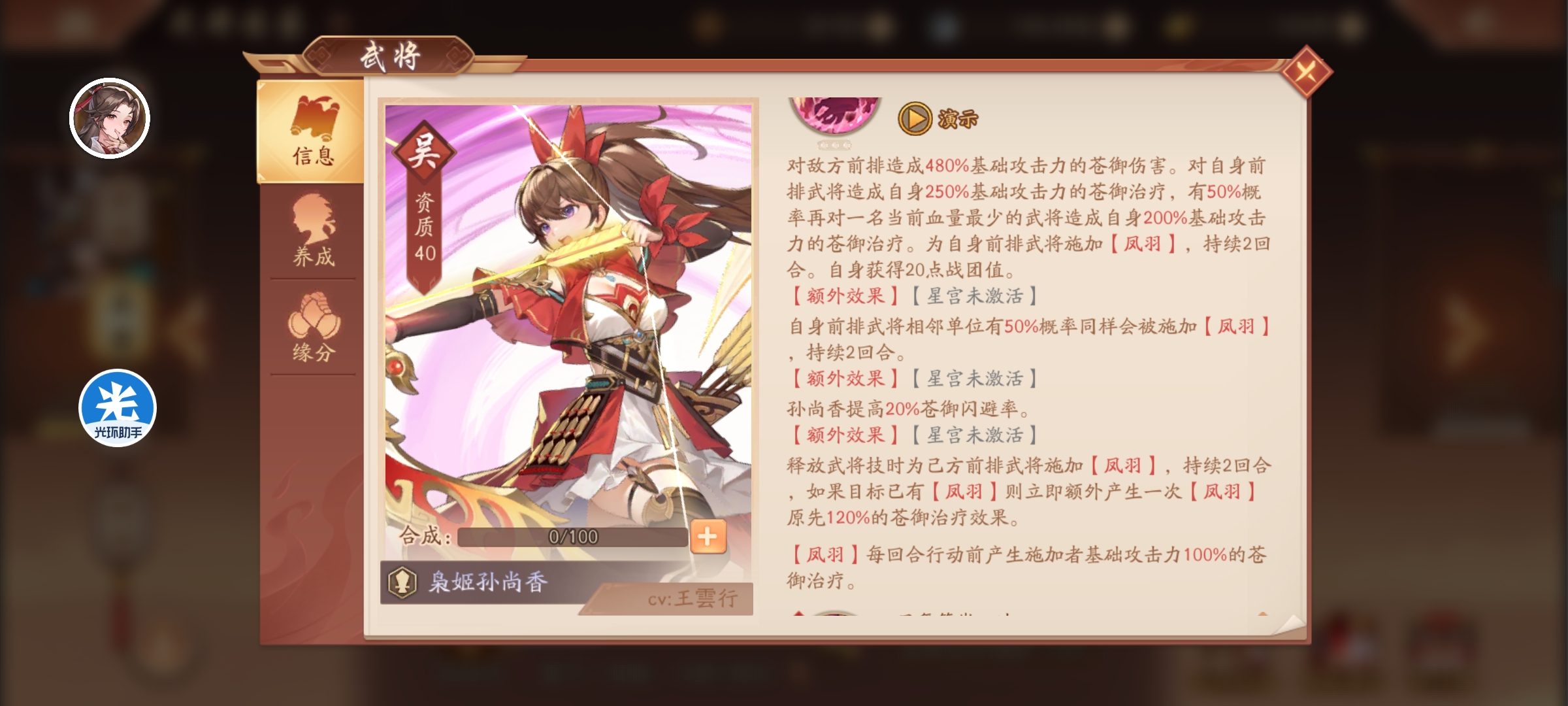 鸾姿凤态:提升相当于孙尚香10%基础攻击的苍御攻击,每回合前2次受到主动出手伤害时产生孙尚香100%基础攻击的苍御治疗。