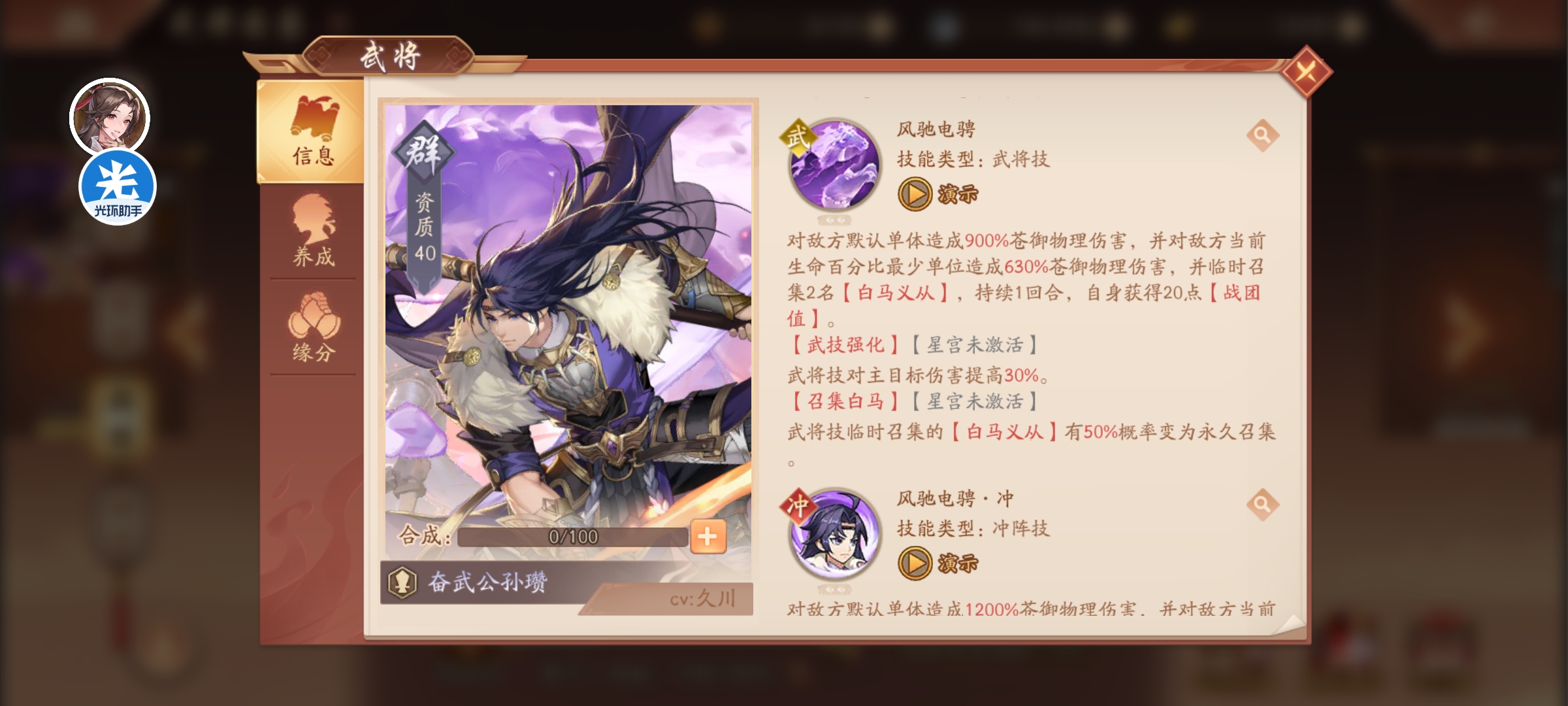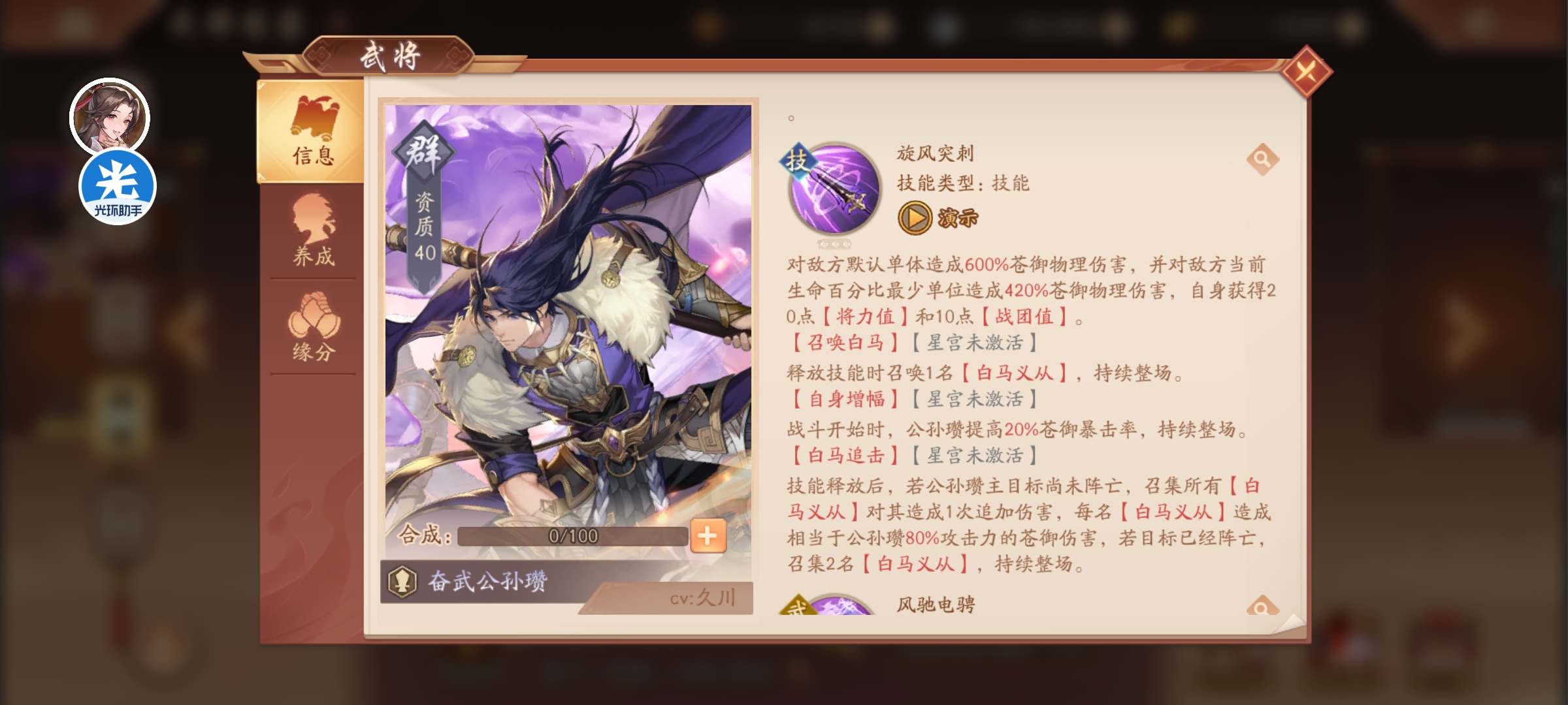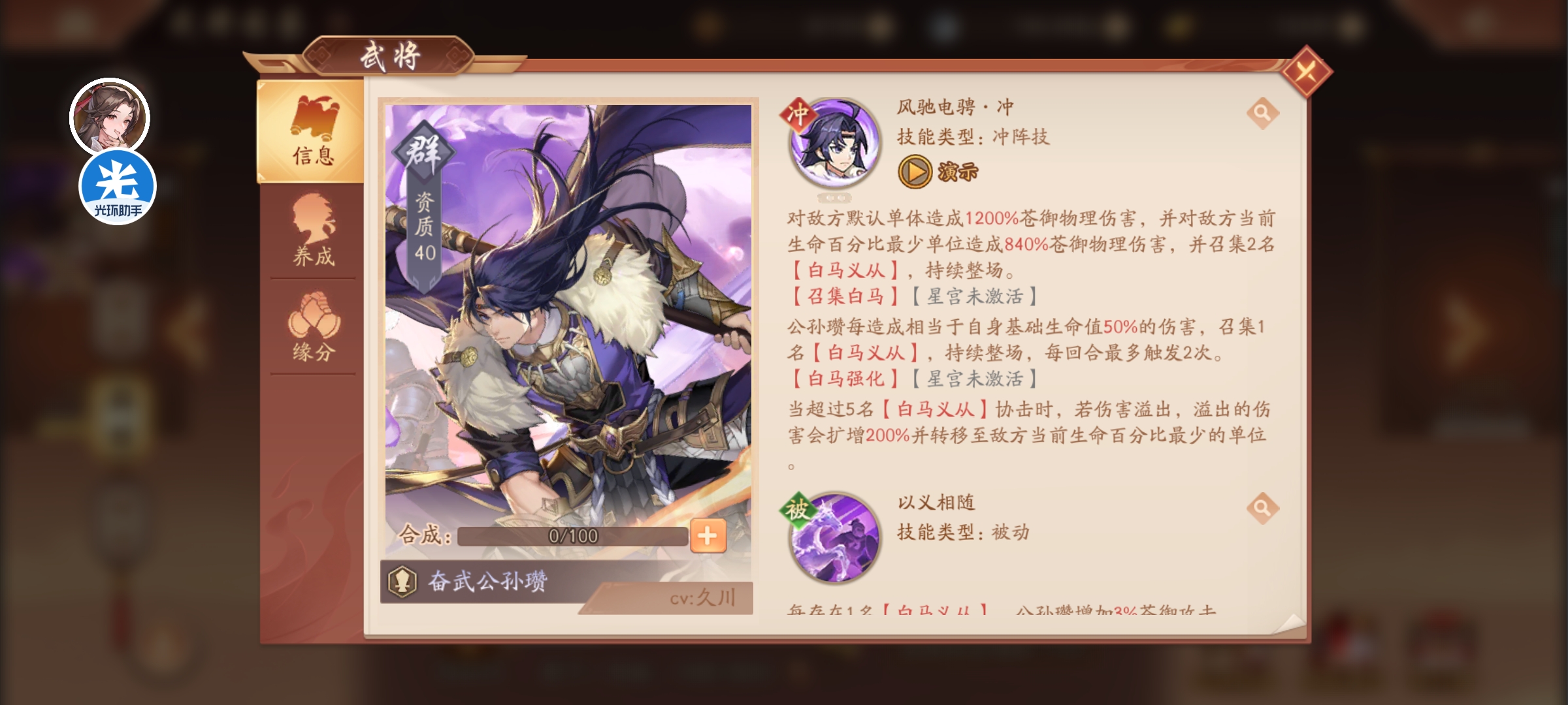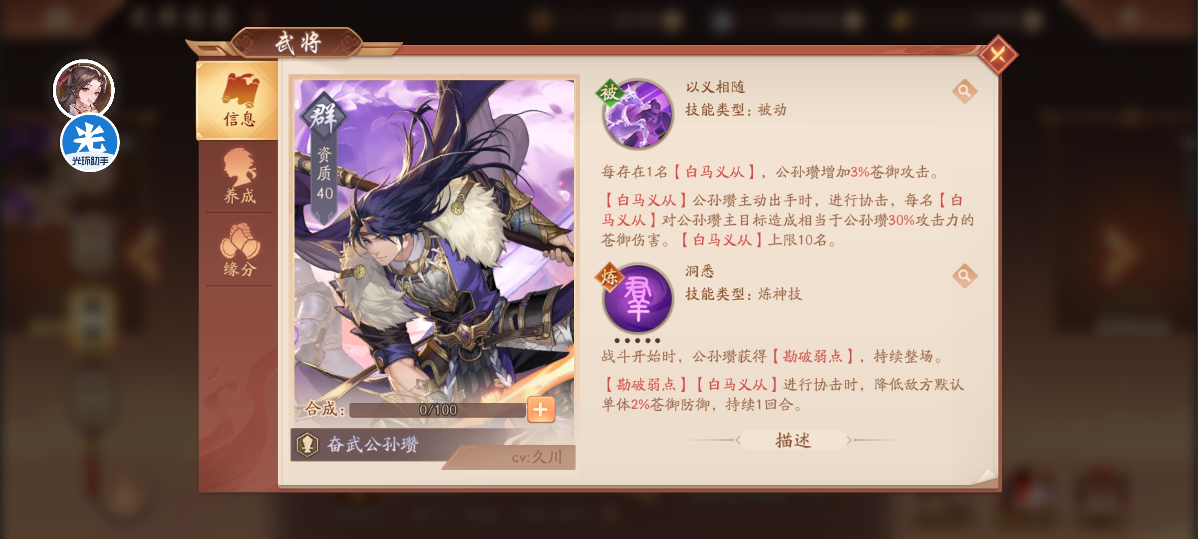 洞悉开局公孙瓒获得勘破弱点持续整场,白马义从进行协击时,降低敌默认单体2%苍御防御持续1回合。