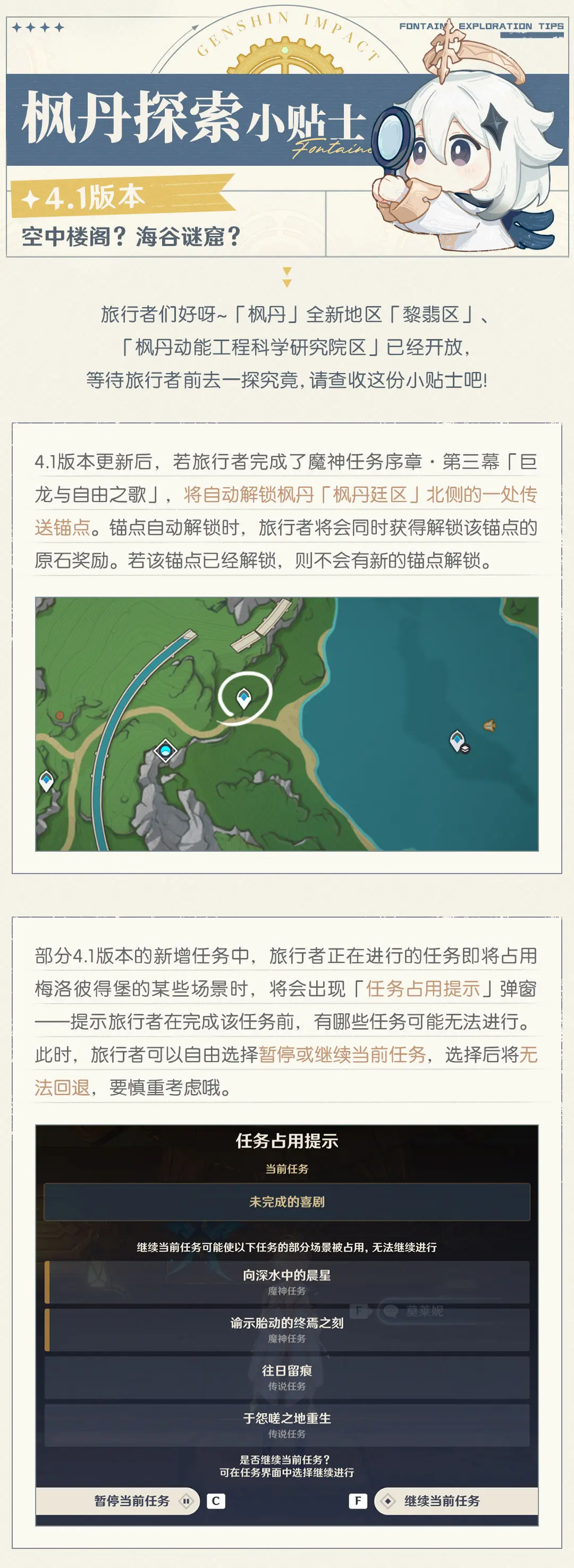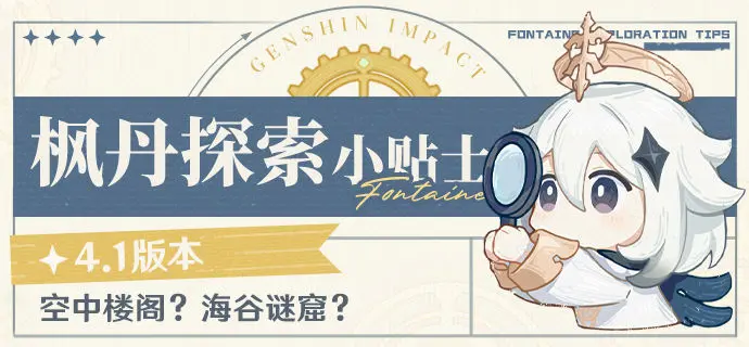 空中楼阁?海谷谜窟?——4.1版本枫丹探索小贴士原神 - 新闻星发布于 2023-09-27关注 旅行者们好呀~「枫丹」全新地区「黎翡区」、「枫丹动能工程科学研究院区」已经开放,等待旅行者前去一探究竟,请查收这份小贴士吧!