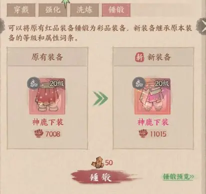 开启锤锻功能后,城主们可消耗一定数量的[它山石]将红色品质装备升级为彩色品质装备。