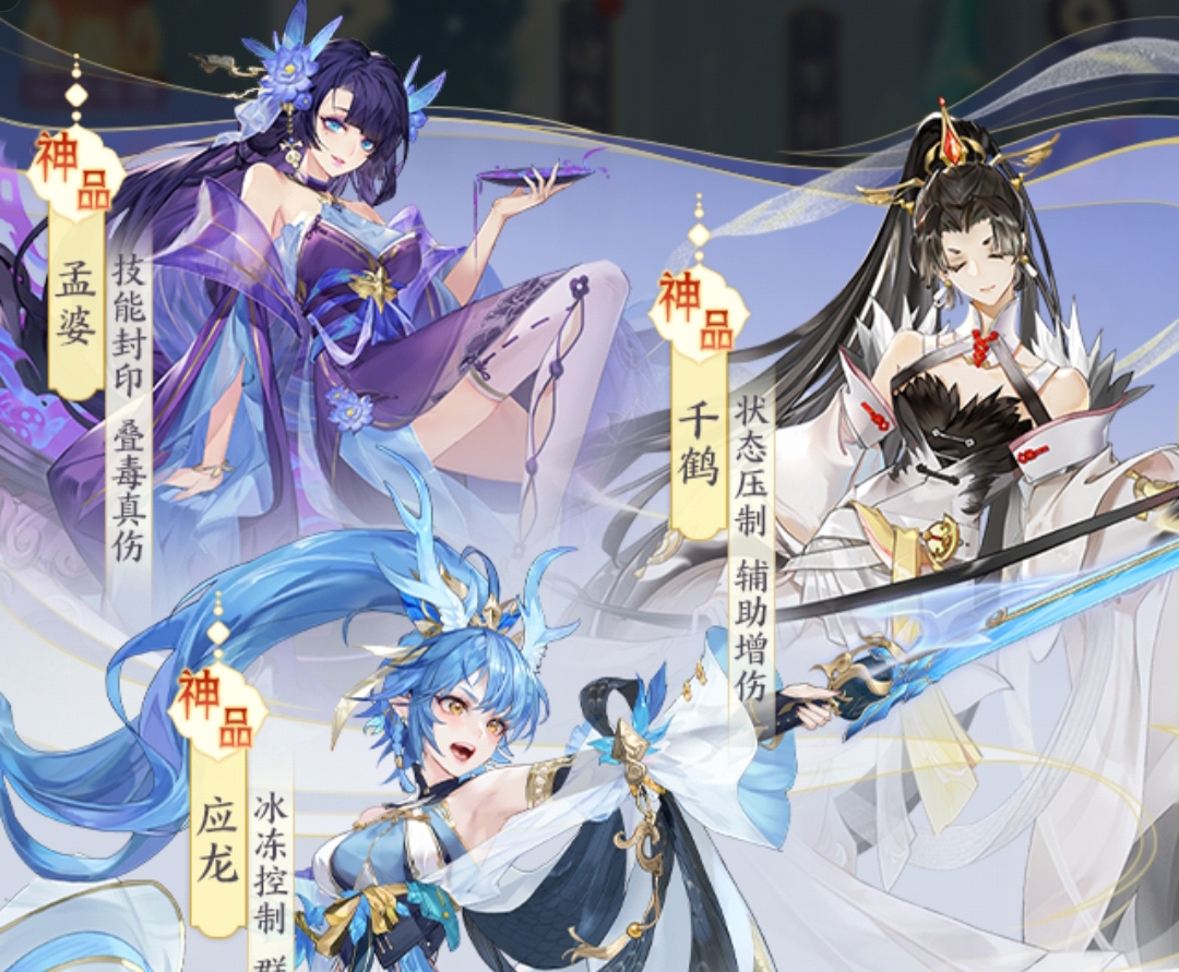 这三个神品都各有优点和特点,应龙和孟婆定位为输出妖灵,千鹤为辅助妖灵。