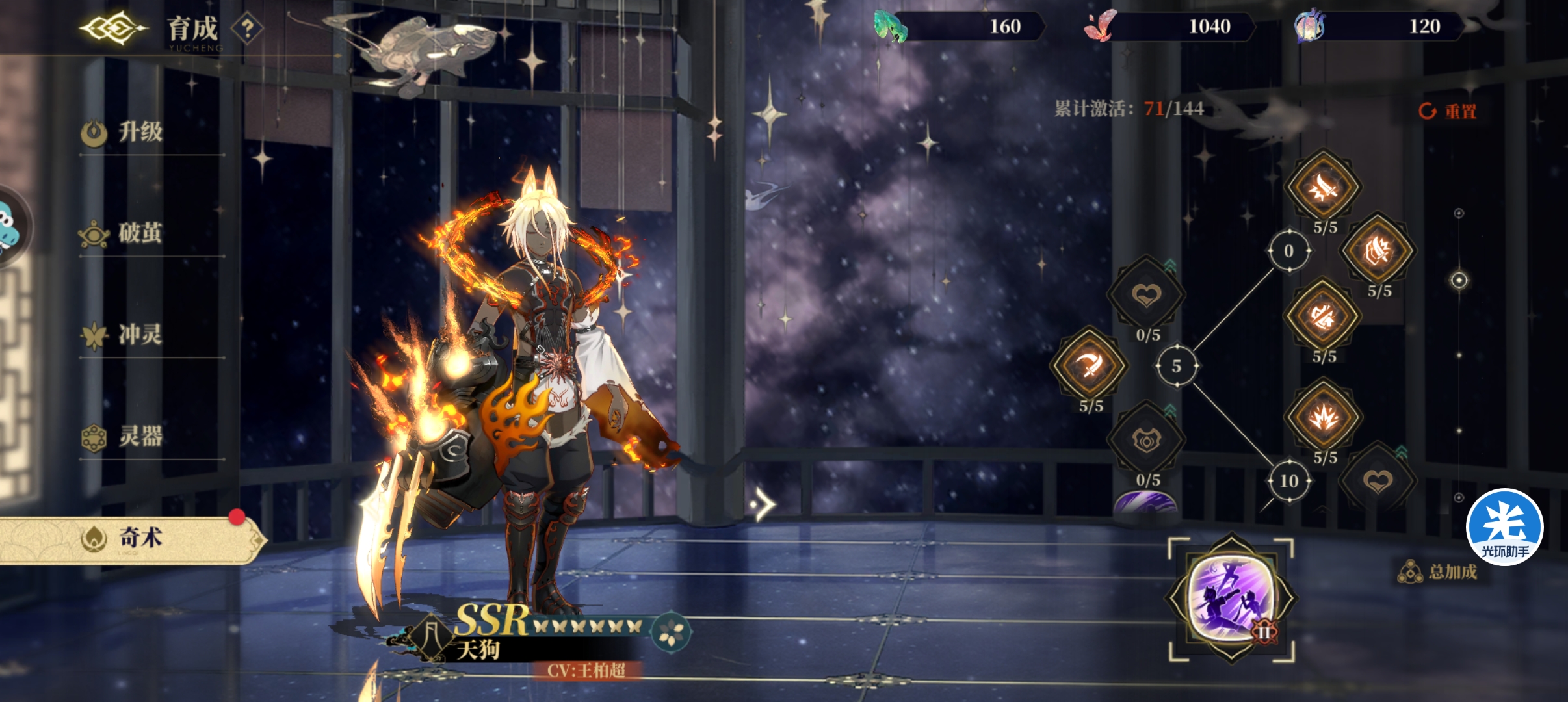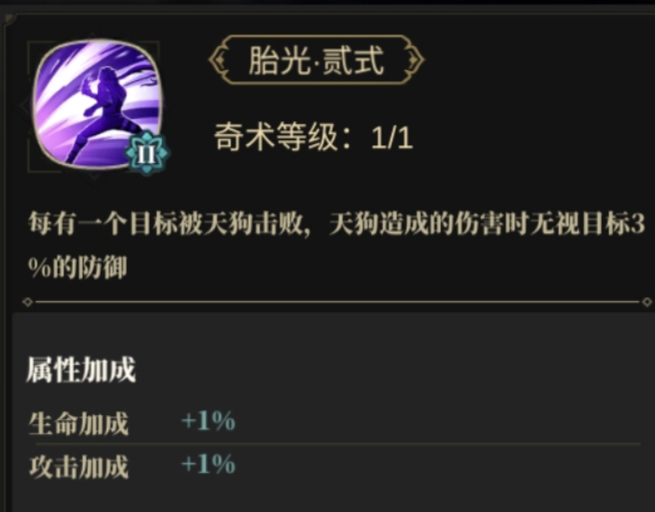 ①【胎光】:每击败一个目标天狗都可以增加一定无视防御的效果。这个奇术技能比较适合pve,加强天狗的一技能效果。