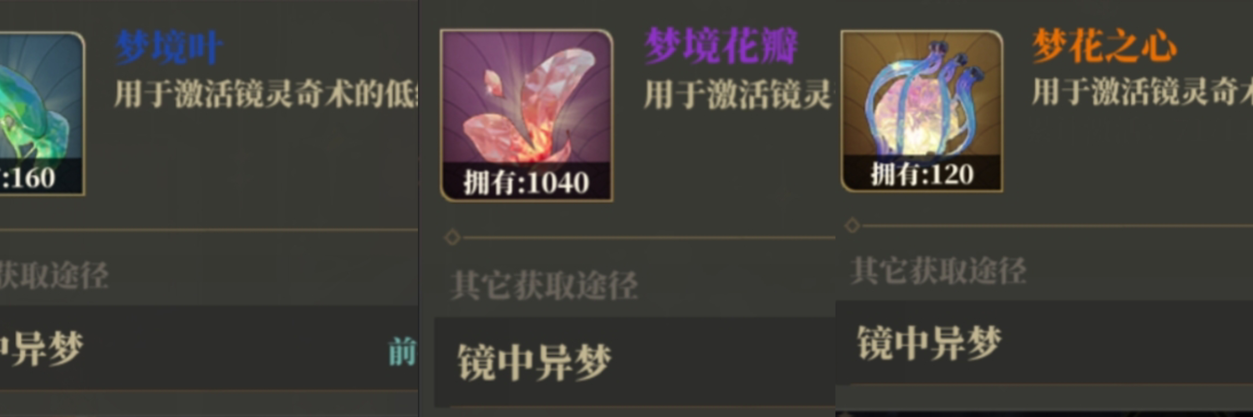 材料一共分为:【梦境叶】【梦境花瓣】【梦花之心】,这三大材料。