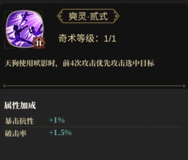 比如:天狗的奇术—【暴击伤害】【攻击加成】【破击强度】。