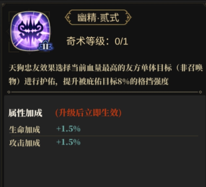 ③【幽精】:强化天狗的3技能庇佑效果,加强被庇佑的格挡强度。