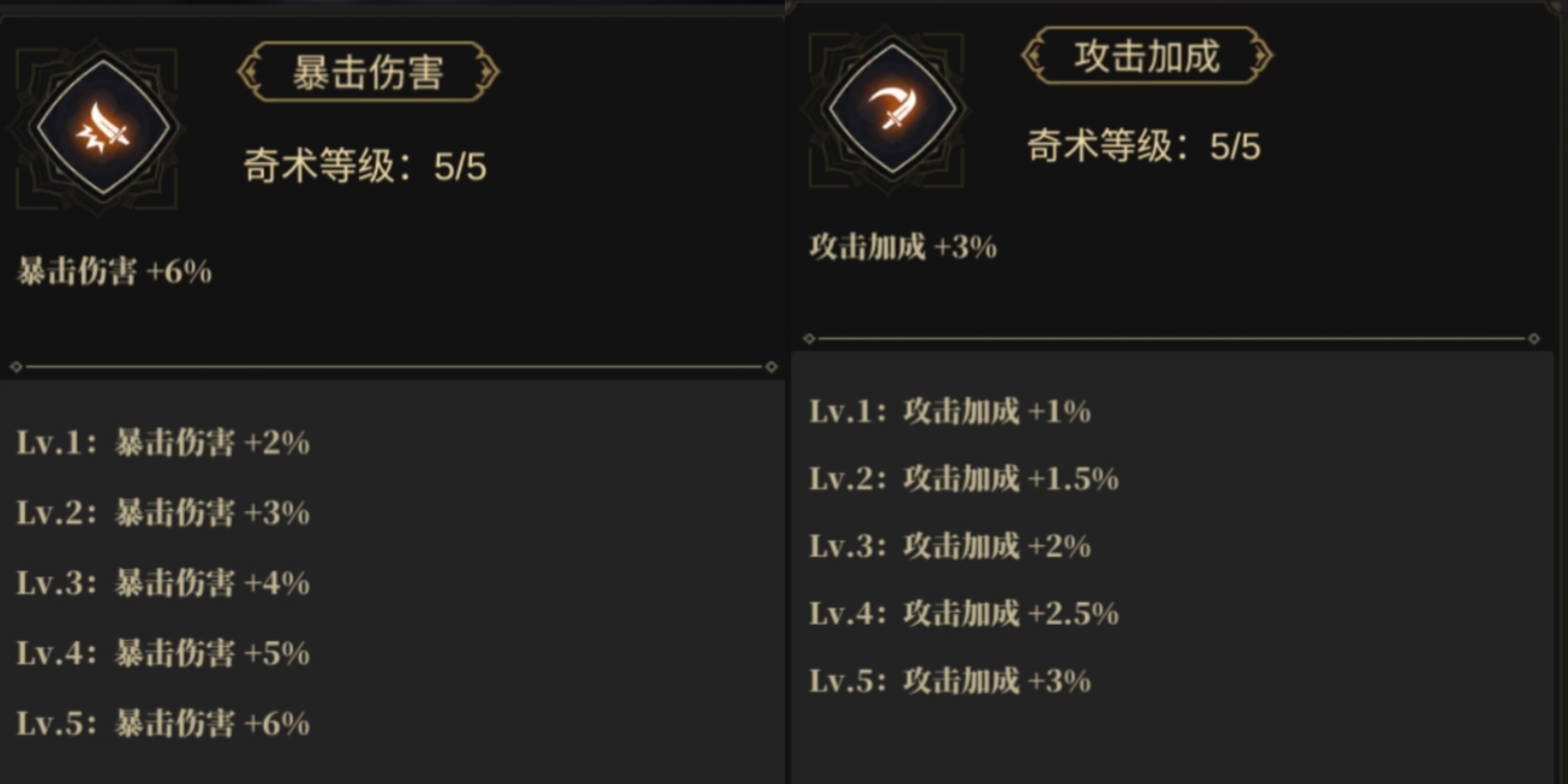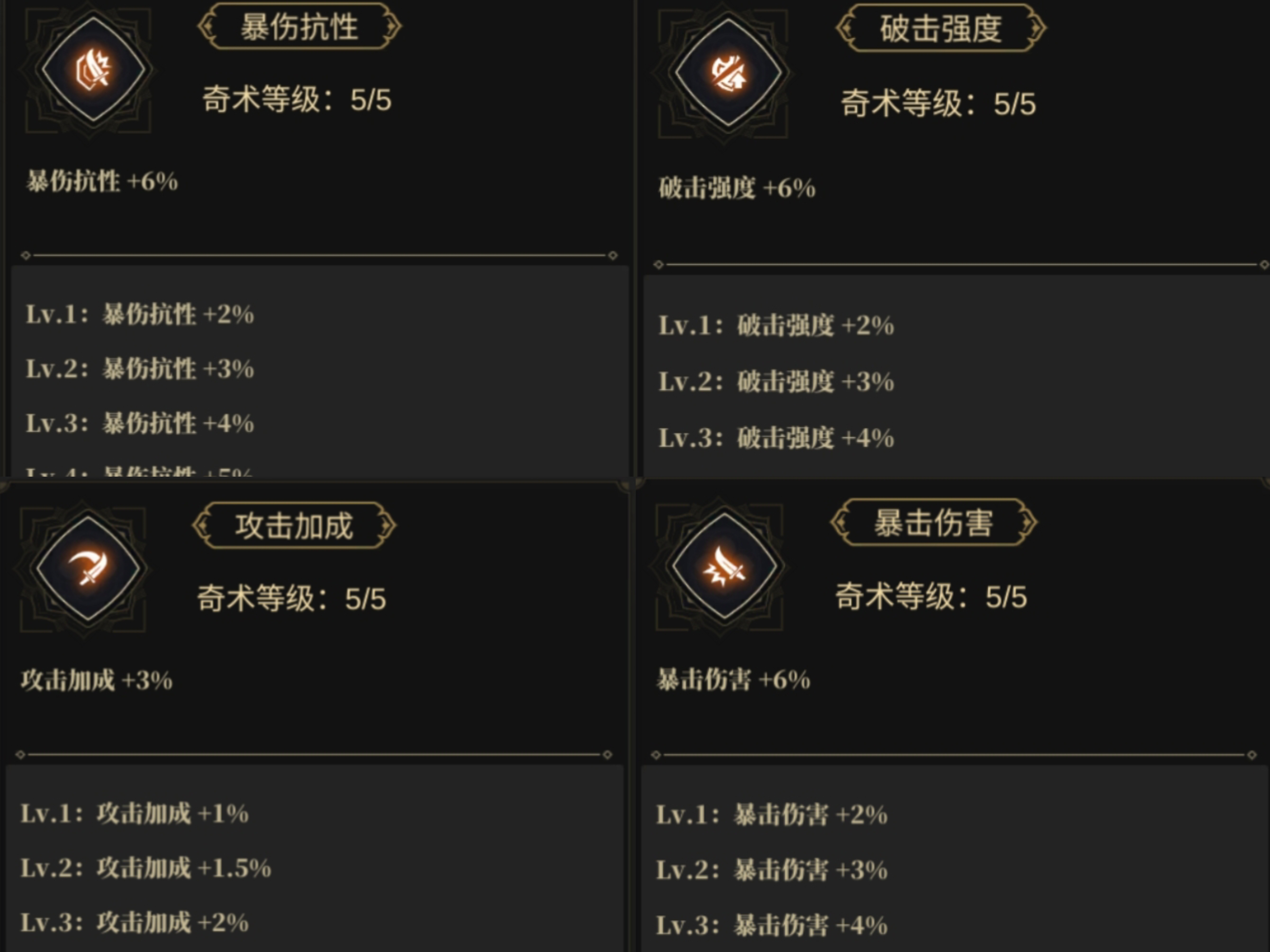 ①【奇术】属性包括:暴击加成、攻击加成、暴击伤害、生命加成、防御加成、暴伤抵抗和破击等等。