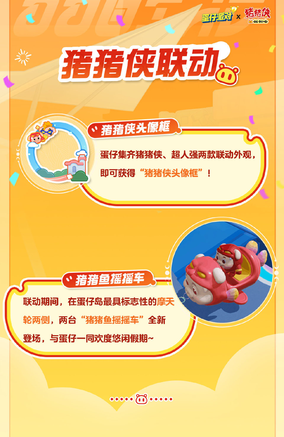 ⭐蛋仔抽取猪猪侠或超人强盲盒一次,即可获得动作“跳绳”,集齐猪猪侠、超人强两款联动外观,还可获得猪猪侠头像框![憧憬]在蛋仔岛的摩天轮两侧,更有两台“猪猪鱼摇摇车”全新上线哦~