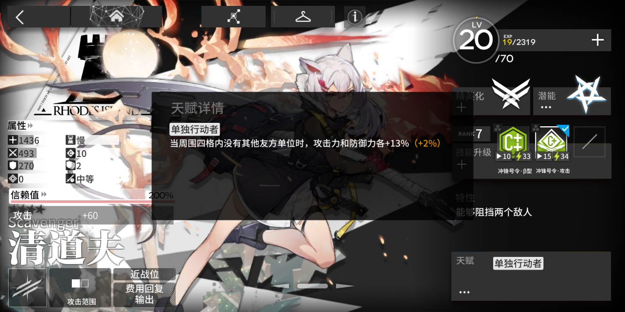 清道夫的特点主要在她的天赋上。单独行动者:周围无有方单位攻击力防御力增加。这个天赋主要是在敌人从几个方向进攻时,可以把清道夫放在那里独守一路。