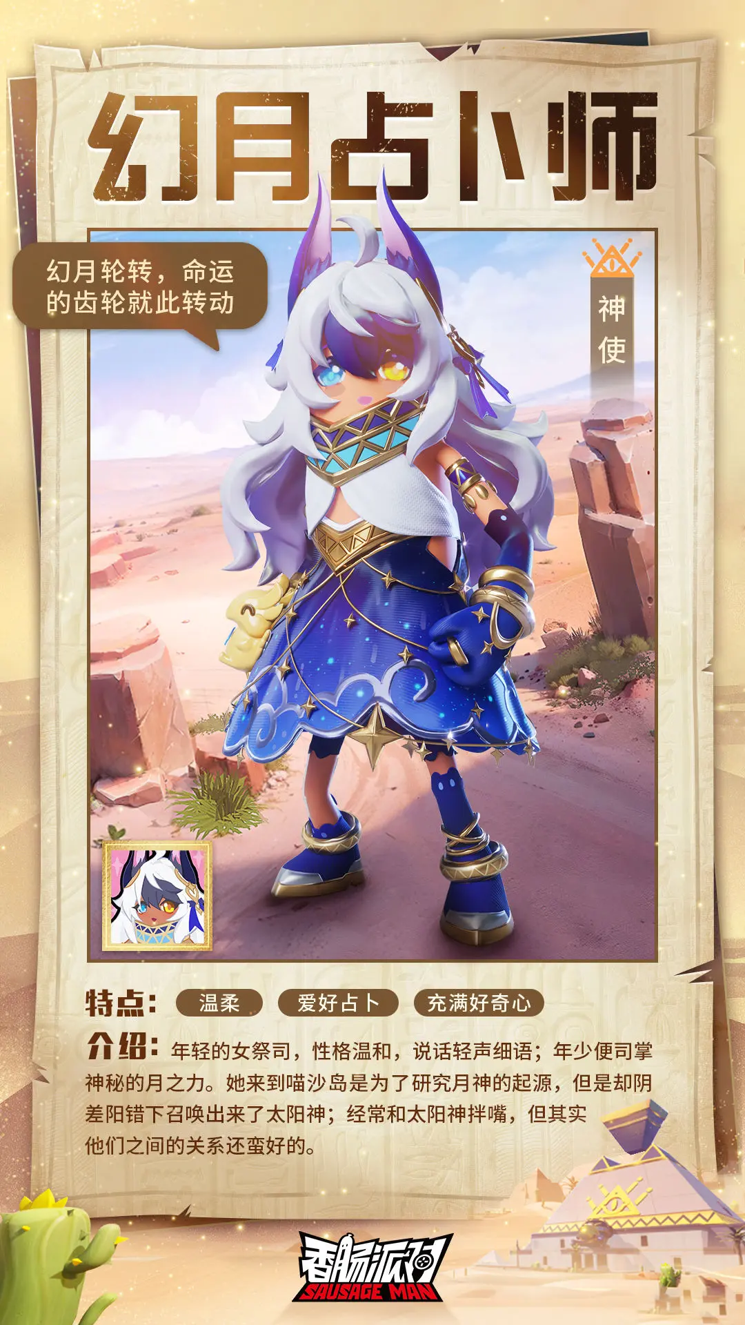 【SS12爆料】幻月占卜师-神秘温柔的月神神使香肠派对 - 新闻星发布于 2023-10-02关注幻月占卜师是喵沙岛的神秘祭司,年纪轻轻的她就拥有着月神之力。为了研究信仰的月神,占卜师来到了喵沙岛,在机缘巧合下召唤出了喵沙岛的守护神明。之后她就与太阳神一起,用神力共同守护喵沙岛上的居民们。表面上来看她与太阳神是经常拌嘴的冤家,但实际上他们却是最好的朋友。