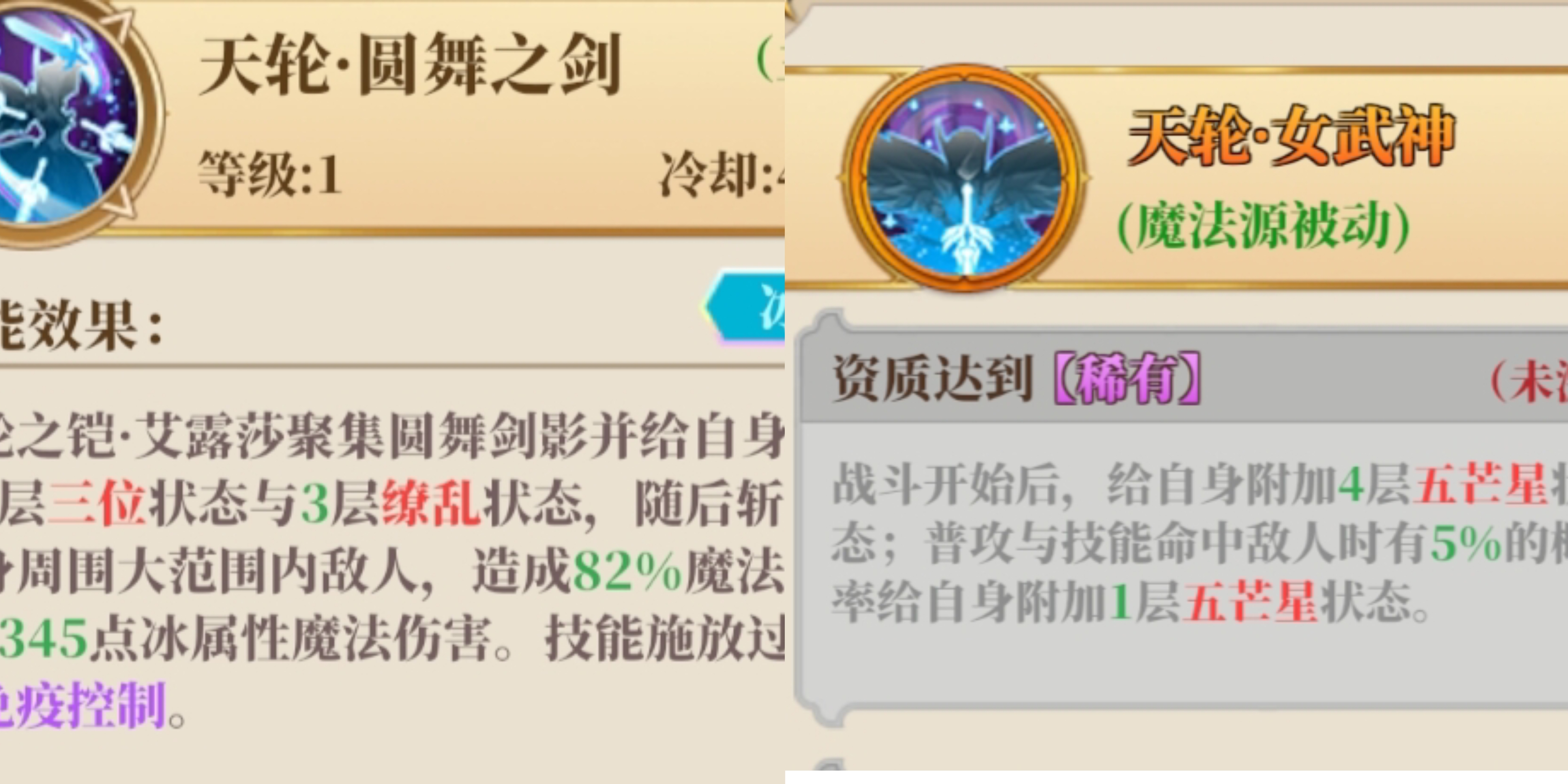 ⭐具体技能释放:4技能【圆舞之剑】输出和叠加【三位】和【缭乱】状态,然后接3技能【五芒星之剑】释放消耗状态。可以获得7层五芒星状态,7层加成是22%的伤害加成。