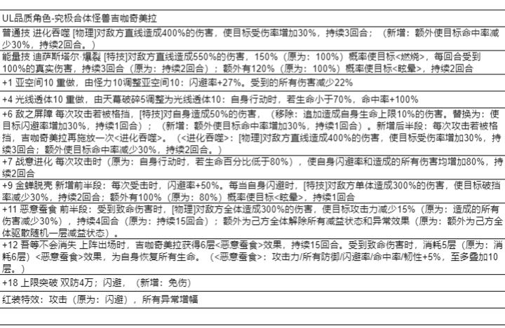 解析:这个被动升级的就是前半段的伤害,受到了格挡的话会对自身造成无乳汁的伤害,增加自身的闪避率和命中率,这个都是新增加的,原来的就是对自身造成10%生命上限的伤害,这个是生命上限的话,如果作为主推来的话,这个生命上限的伤害是非常高的,会对自身造成不小的损害。所以这次改动50%的伤害对自身是不痛不痒的存在,后半段增加的就是一个,如果被格挡就会进行一次普通技能的释放,这个如果打格挡角色的话可以连续释放,总体来说增强的还是不错的,增加受伤率合并减少命中率