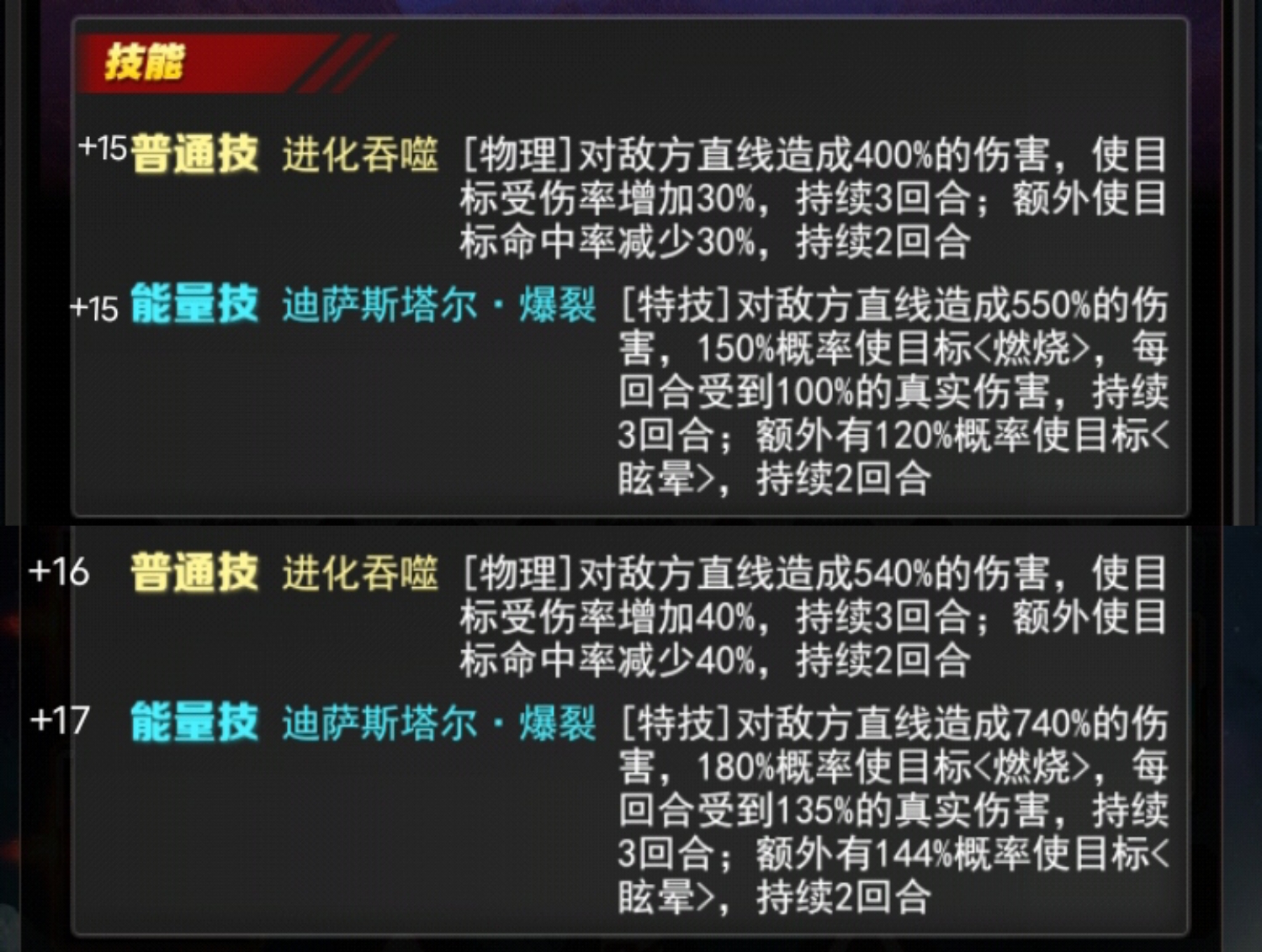 +17 能量技迪萨斯塔尔·爆裂[特技]对敌方直线造成740%的伤害,180%概率使目标<燃烧>,每