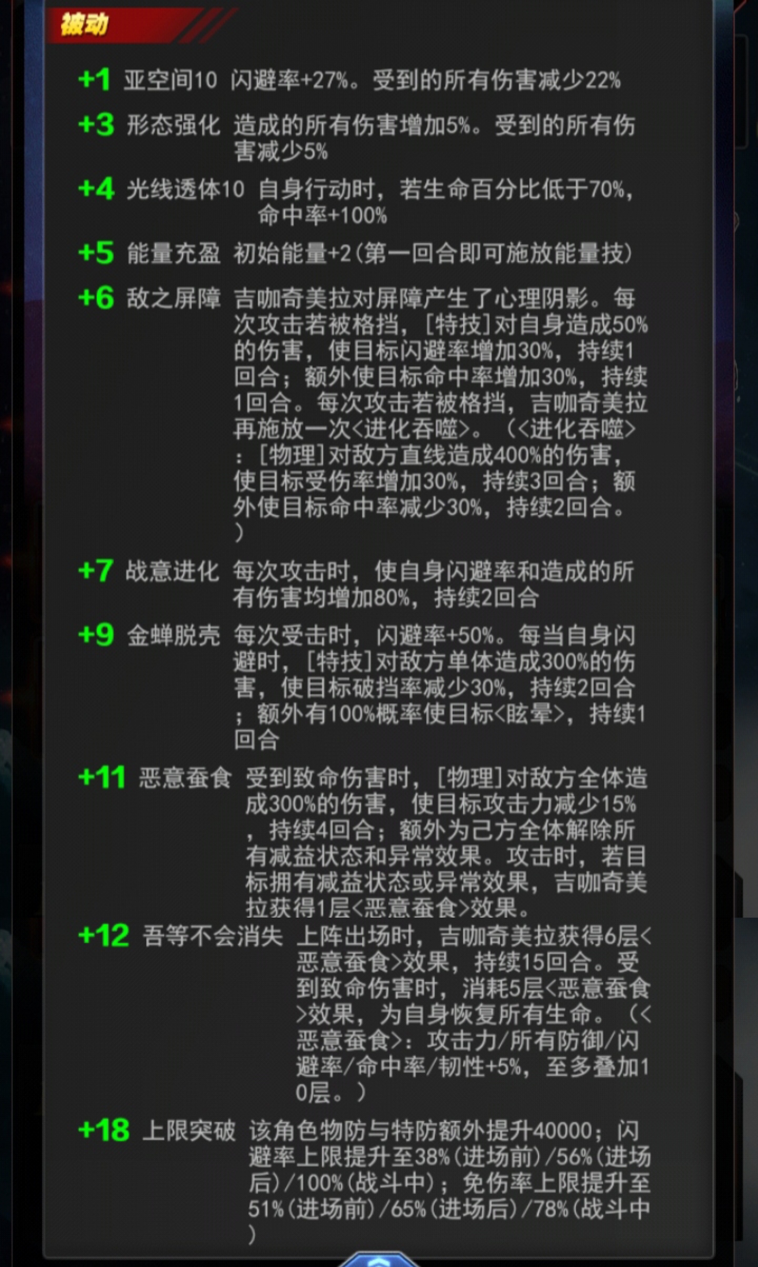 +7 战意进化每次攻击时,使自身闪避率和造成的所有伤害均增加80%,持续2回合