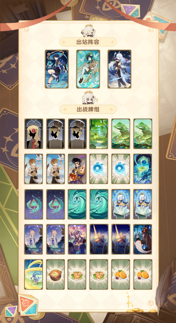 「赌徒的耳环」:中快攻卡组必备回费圣遗物,不过本卡组中只配备了一张,比起教官,该卡产生费用收益的条件还是偏苛刻了一些。「教官的帽子」:扩散卡组常配备的圣遗物,比起其他元素反应,扩散反应触发的会更频繁,该卡回费的概率很高,在流浪者特殊机制的搭配下,触发则更为容易,因此本卡组中配备了2张。「须弥城」:场地投资牌,在教官帽子圣遗物搭配下,可以比较容易在手牌较少时触发特效,不过还是要保证比较大的过牌量来触发较好。「寻宝仙灵」:1费过3张牌,本卡组在前期就有较大的行动次数,搭配教官圣遗物更是有不错的回费量来增加行动次数,能够更好的利用该牌过牌。「桓那兰那」:存费用费,可以将无效骰收集起来,在次回合利用流浪者的普通攻击消耗无效骰,并通过教官圣遗物产生有效骰。「提米」:跨回合蓄爆牌,适合在第一回合打出,第三回合进行爆发输出。「自由的新风」:“连斩”的0费秘传牌,在「风与自由」削弱后,该牌的登场可以说让所有快攻卡组都会考虑在构筑中配备该卡,特别是本卡组这类对后台有高额输出的卡组,可以实现1动击杀2人,再动击杀第3人的漂亮combo。「重攻击」:搭配流浪者的普通攻击,增加其普通攻击斩杀线,在对方后台为核心角色时且达到使用该牌后的斩杀线时,可以打出该卡完成击杀。「元素共鸣:迅捷之风」:双风共鸣卡牌,能让我方角色快速打出元素反应,避免申鹤重复施放元素战技导致冰翎浪费。食物牌:仙跳墙搭配流浪者元素爆发有很高的斩杀线,其他食物则用来防止角色启动前就暴毙。打法公式二:寻宝仙灵→申鹤元素战技→提米→立本,蓄爆结束第一回合。打法公式三:寻宝仙灵→申鹤元素战技→须弥城→申鹤普通攻击(元素战技),等待第二回合申鹤开启元素爆发。