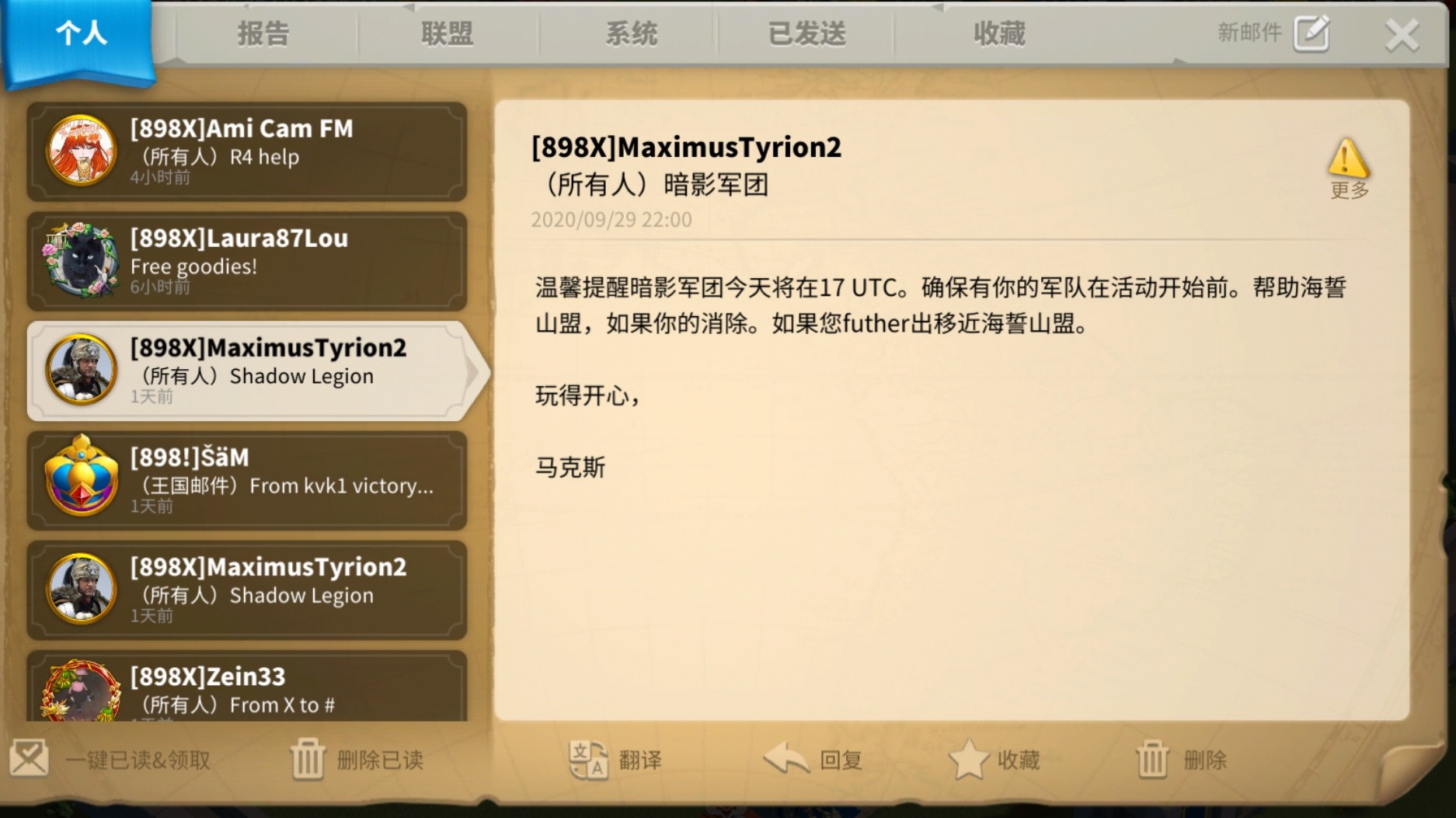 联盟有一些注意事项、玩法攻略或活动通知都会通过联盟邮件通知大家,大家一定要注意仔细浏览联盟邮件。在之前的游戏中,我常常发现有些成员不听指挥擅自行动或是活动无故缺席,但其中有的并不是有意为之而是忘了定时查看邮件通知。