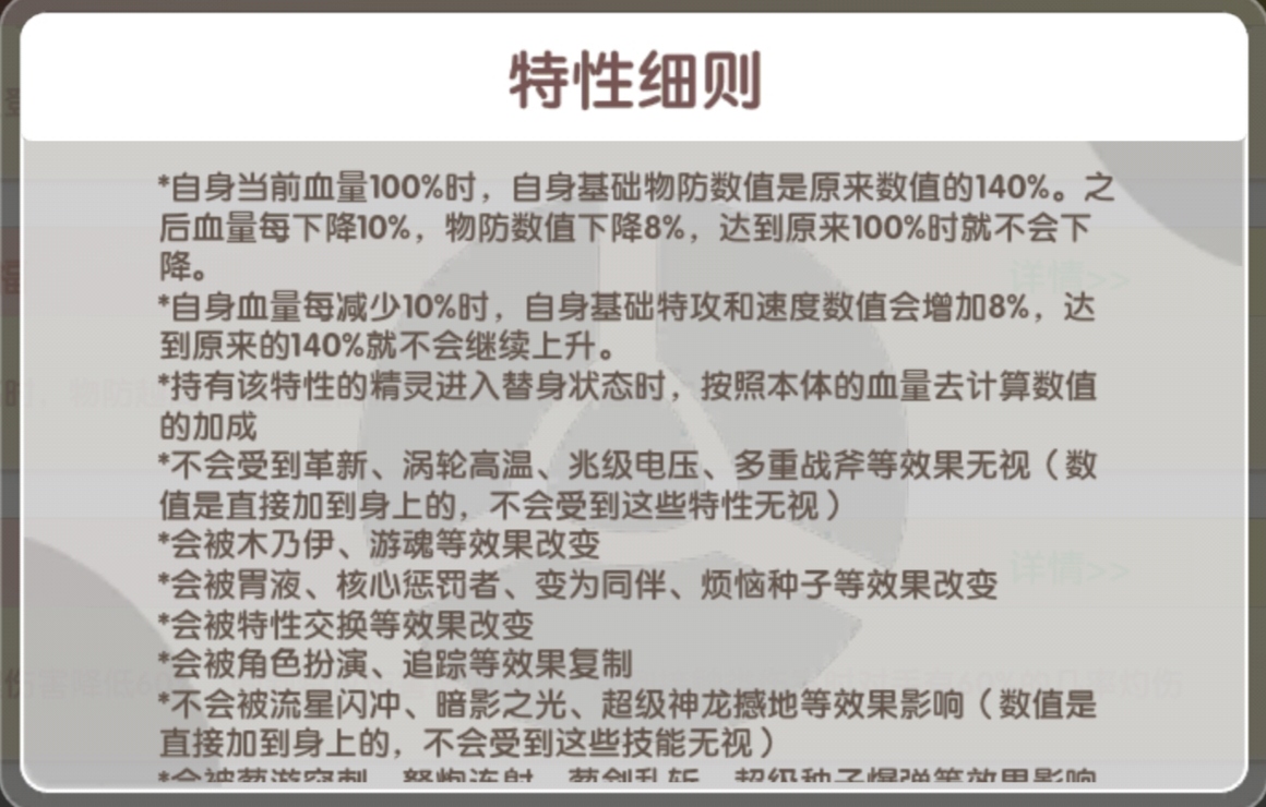 ①拥有该特性的宝可梦出场时会变为1点血,其他血量会转化为恨意,[恨意数值(血量1.5倍-1)],自身受到攻击,会从恨意中扣除,当恨意为0时,这时本体就会受到伤害了,受到间接伤害也只会先扣除恨意。