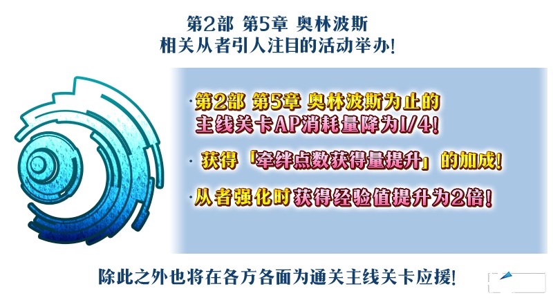 以下时间段内,主线关卡第2部 第5章 奥林波斯为止的AP消耗量限时降为1/4!(即使在战斗中撤退,AP消耗量也会降为1/4)