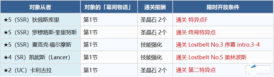 ※满足限时开放条件通关「幕间物语」时尚未拥有对象从者的情况下,在获得对象从者时将反映强化的内容。