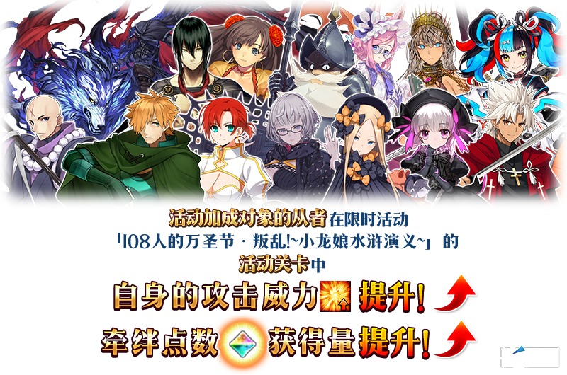 限时活动「108人的万圣节·叛乱!~小龙娘水浒演义~」期间内,部分从者将在活动关卡中被付与「自身的攻击威力提升」和「羁绊点数获得量提升」的效果!