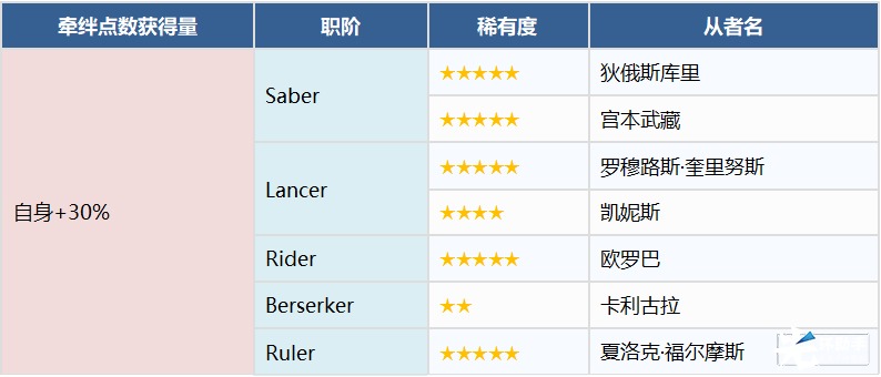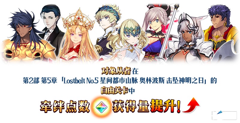 在本次活动的期间内,下表中的从者在第2部 第5章「Lostbelt No.5 星间都市山脉 奥林波斯 击坠神明之日」的自由关卡中,将获得「牵绊点数获得量提升」的加成效果!