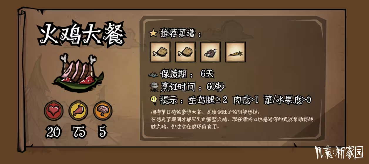 终于从【冒险家日记】中找到了些有用的东西,只有这些东西,让我觉得我在万商大会上的钱没白花!饥荒的世界中,健康的食物是生存下去的基本!看起来这些食材都蛮常见的, 原来搭配起来能够有这么多新的选择,作为一个肉食动物,这些食谱可太对我的胃口了!
