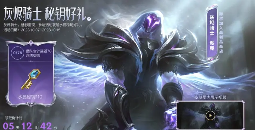 截止至10月15日,召唤师可通过完成推塔任务,在10月13日获取免费的水晶秘钥*10。灰烬骑士 派克将在下周上架战利品商城,召唤师现在可以活动页面提前预览皮肤特效!