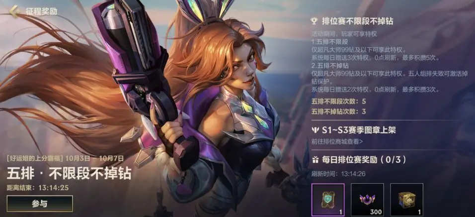 另外“好运姐的上分霸福”活动将在今晚结束,无论是五排不限段、不掉钻的宝贵机会,还是海克斯能量卡、稀有称号等奖励,今晚就是把握最后机会的时刻!
