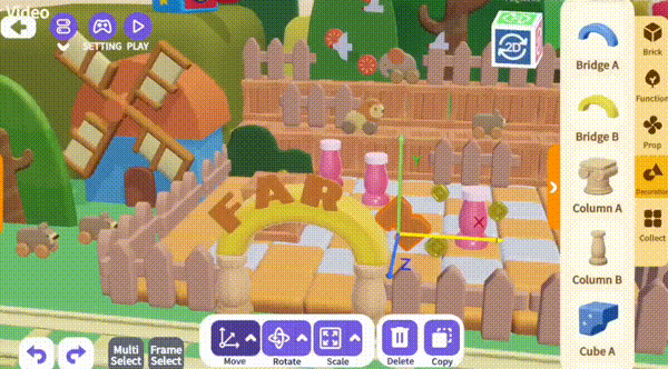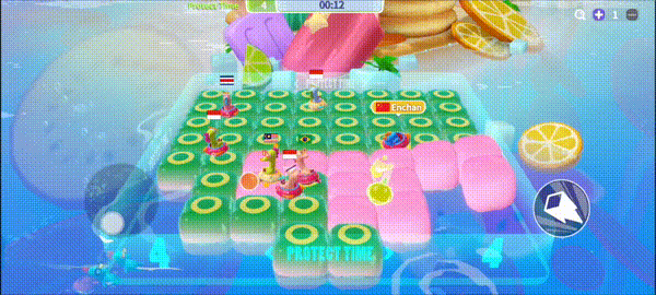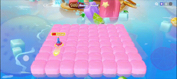 比如在当前开放的地图里,玩家所在的舞台是由许多小方块拼接起来的。游戏过程中,时不时会有一些随机的方块从天上掉下,替换原有的方块;或是遭到飘过来的泳圈的撞击导致一些小方块随机消失;或是部分舞台区域发生对折。