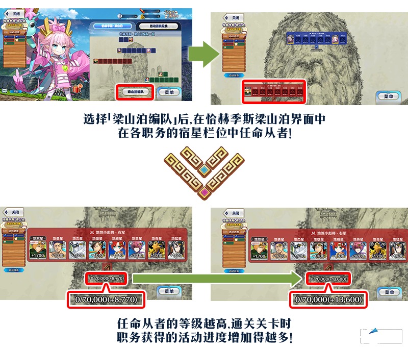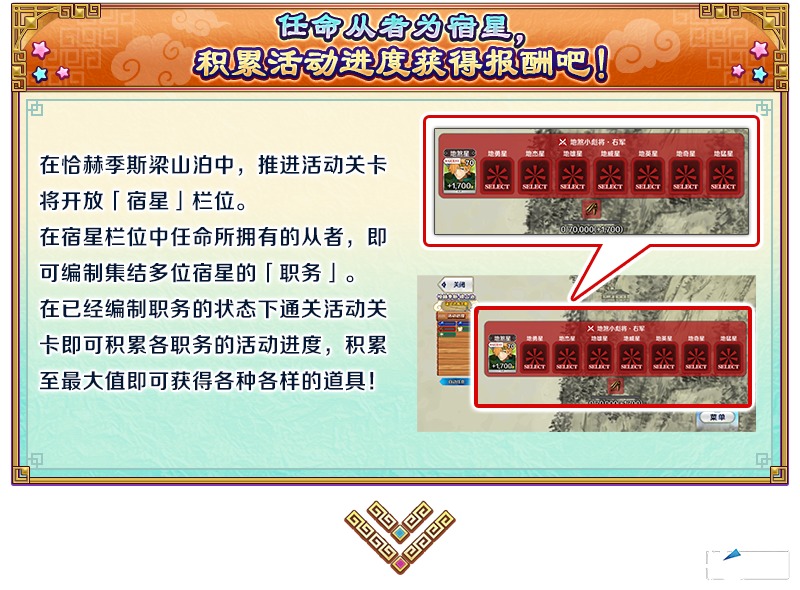 推进活动的主线关卡即可增加可以任命的宿星栏位,在空闲的宿星栏位中任命从者组建自己的恰赫季斯梁山泊吧!