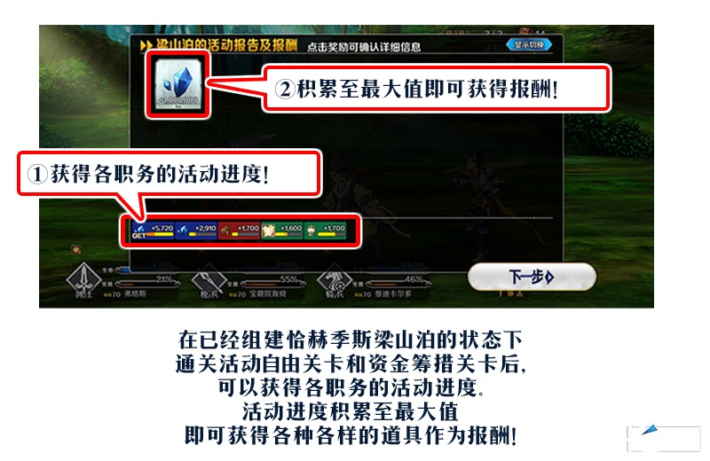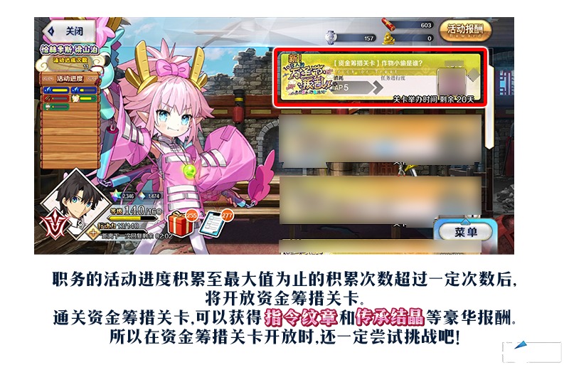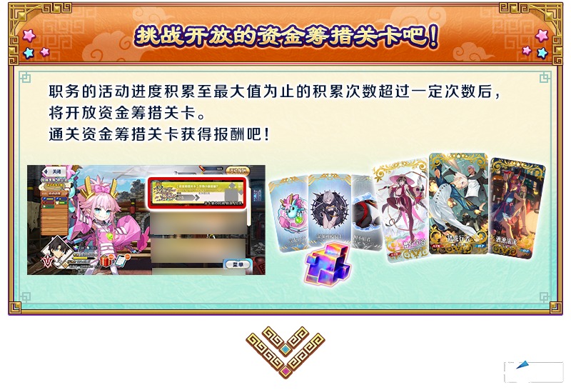 职务由被任命为宿星的从者构成,通关活动自由关卡和资金筹措关卡获得各职务的活动进度,积累至最大值即可获得各种各样的道具!