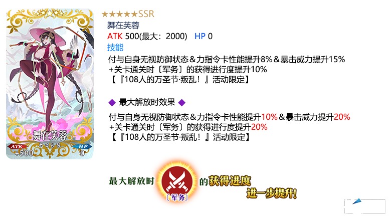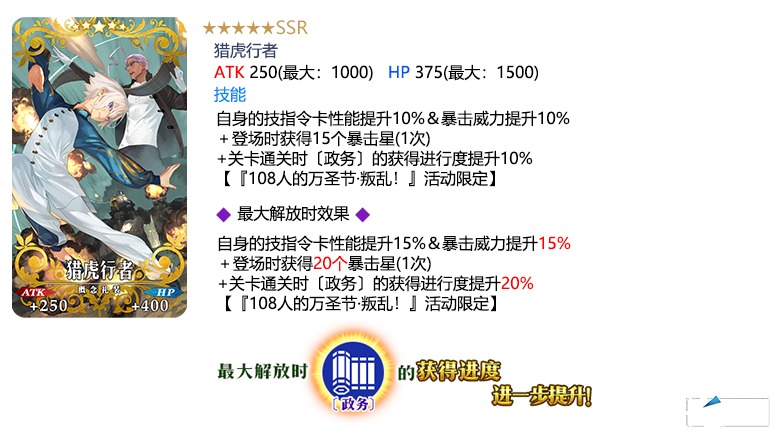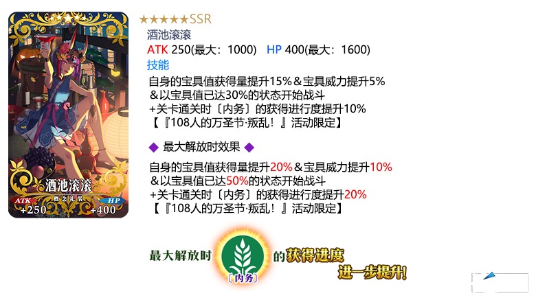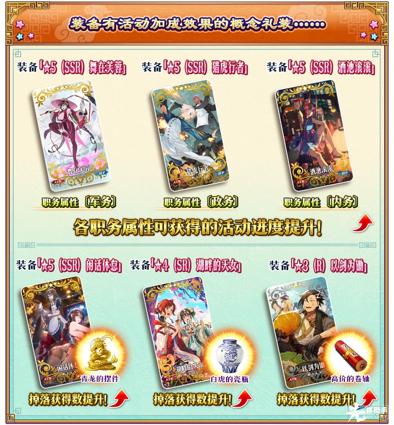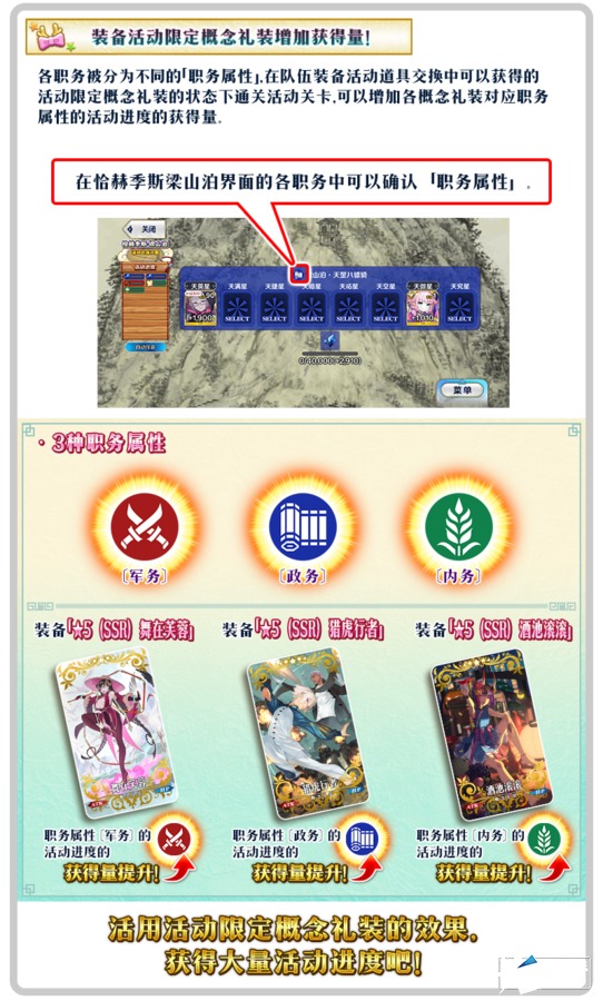 装备在活动道具交换中可获得的活动限定概念礼装「★5(SSR)猎虎行者」「★5(SSR)舞在芙蓉」「★5(SSR)酒池滚滚」,在限时活动「108人的万圣节·叛乱!~小龙娘水浒演义~」中可获得的『职务属性〔军务〕』『职务属性〔政务〕』『职务属性〔内务〕』活动进度提升!