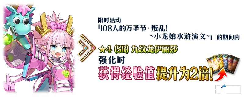 本次活动期间内,强化「★4(SR)九纹龙伊丽莎」时所获得的经验值提升为2倍。