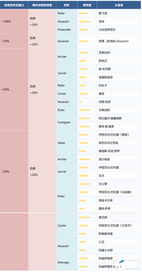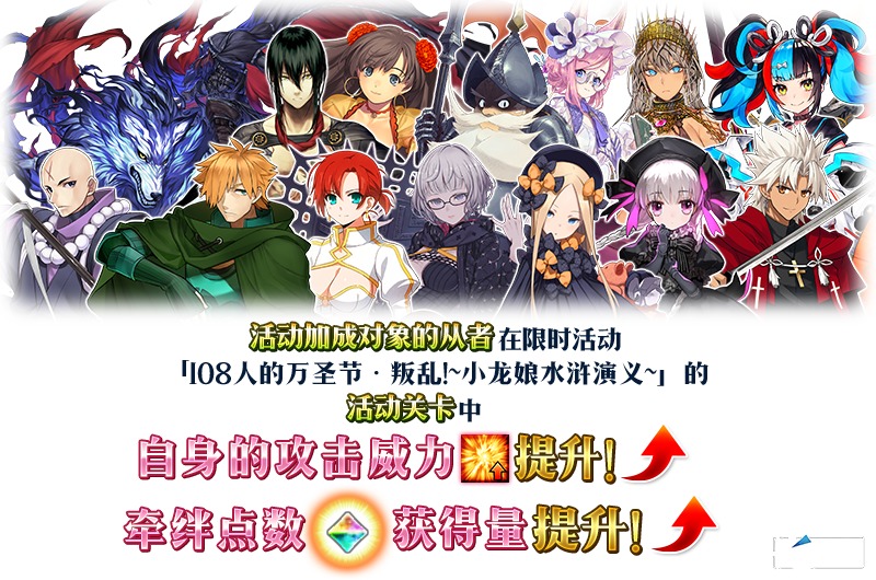本次活动期间内,下表中的从者将在活动关卡中被付与「自身的攻击威力提升」以及「牵绊点数获得量提升」的加成效果!
