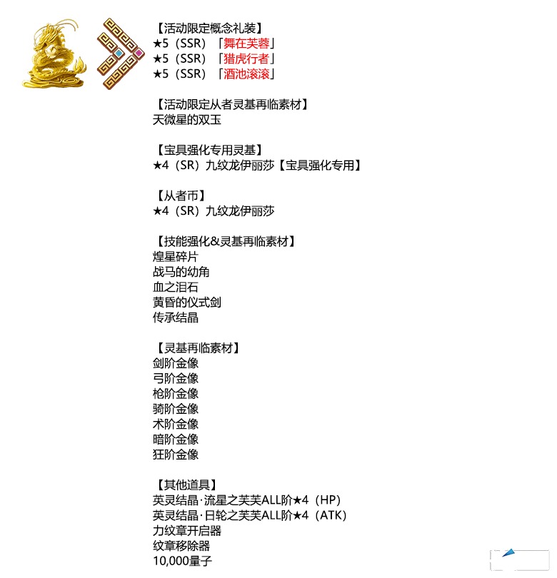 ※「★4(SR)九纹龙伊丽莎」的宝具强化专用灵基将在通关本活动的特定主线关卡后方可交换。