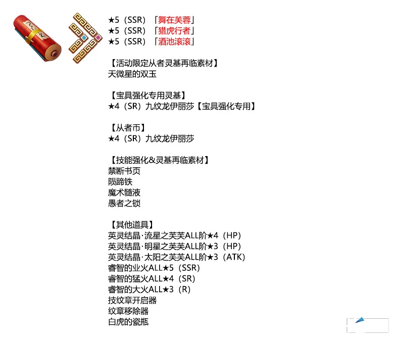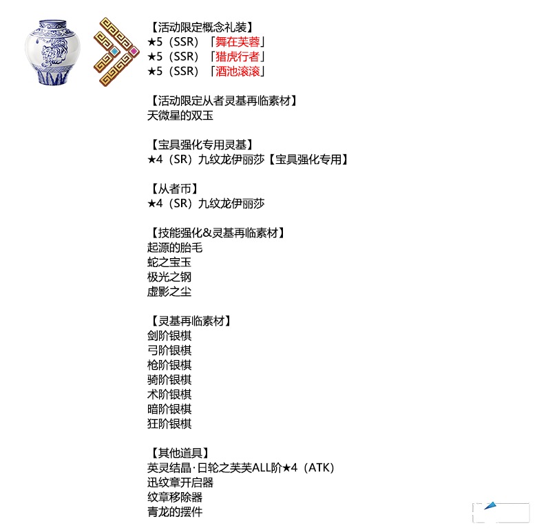 此外,装备圣晶石召唤中被推荐召唤的限时概念礼装「★5(SSR)闲话休怠」「★4(SR)湖畔的天女」「★3(R)以剑为锄」,活动道具「青龙的摆件」「白虎的瓷瓶」「高价的卷轴」的掉落获得数将分别提升!