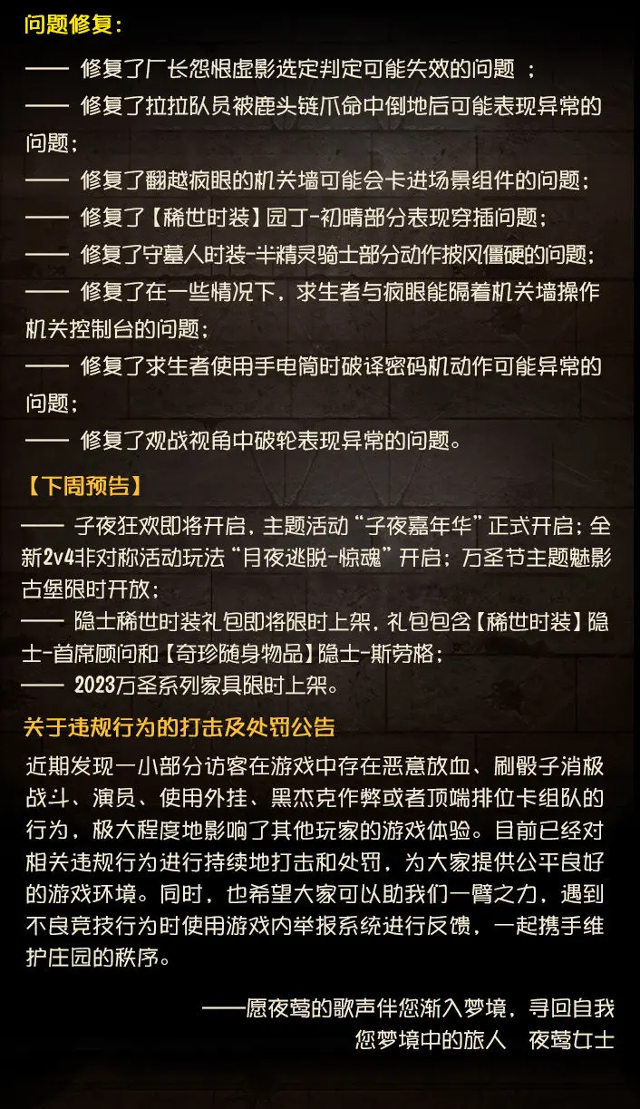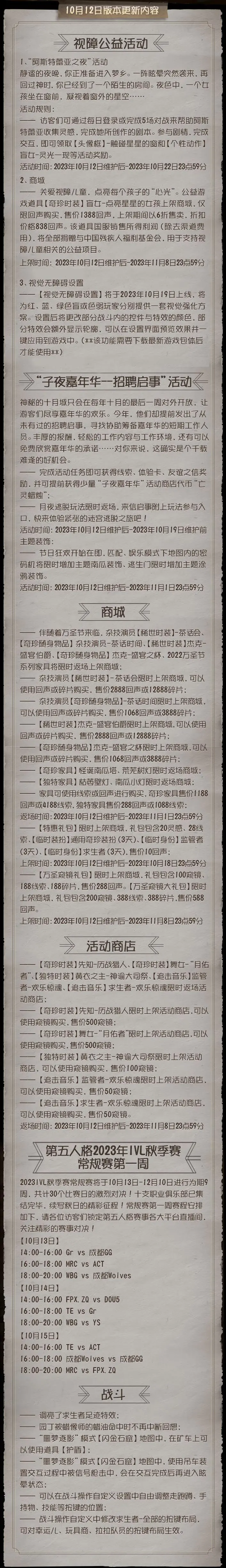 2023年10月12日维护公告第五人格 - 新闻星发布于 2023-10-11关注——“阿斯特蕾亚之夜”活动开启;——公益游戏道具【奇珍时装】盲女-点亮星星的女孩上架商城;——“子夜嘉年华--招聘启事”活动开启;—— 月夜逃脱玩法限时返场;更多内容请点击长图了解~#第五人格维护公告#