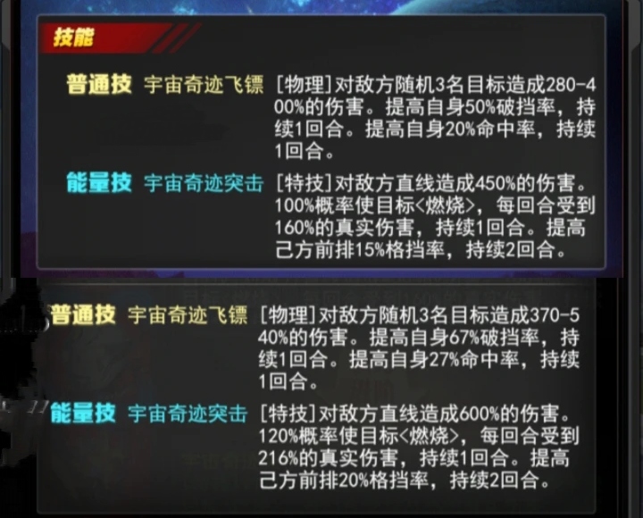 +16普通技 宇宙奇迹飞镖[物理]对敌方随机3名目标造成370-540%的伤害。提高自身67%破挡率,持