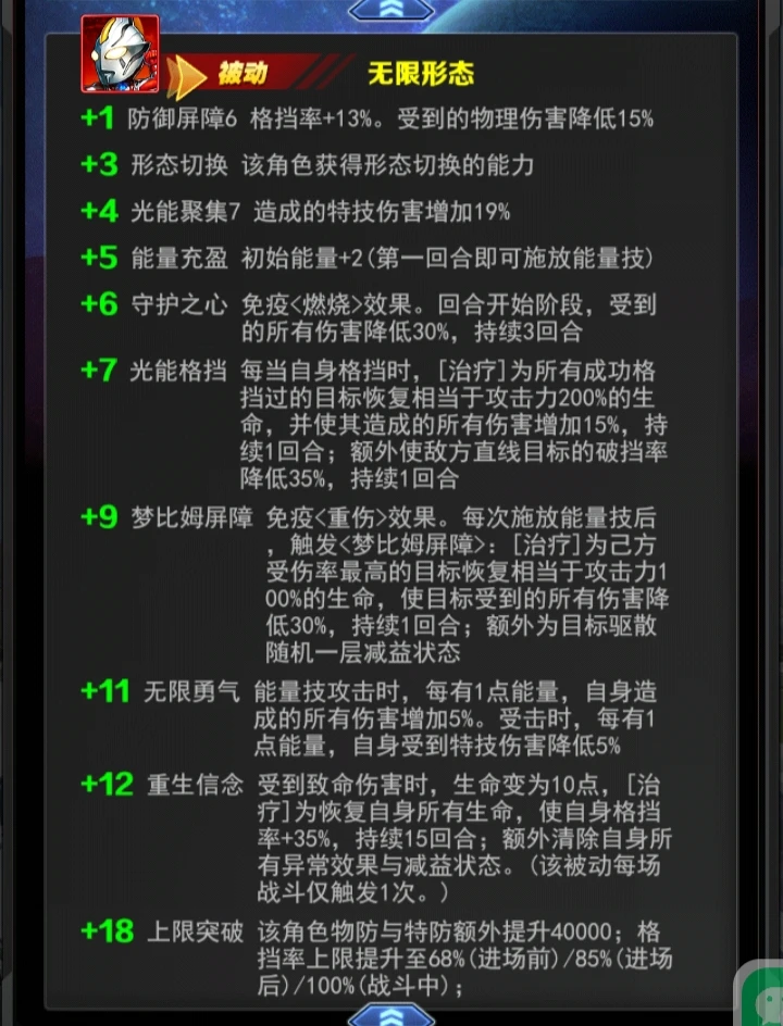 +11无限勇气 能量技攻击时,每有1点能量,自身造成的所有伤害增加5%。受击时,每有1